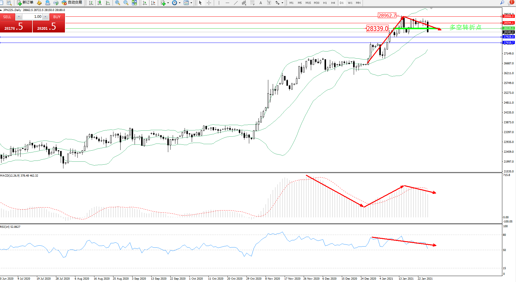 技术点评:多头动力延续布林带指标通道中上轨区间持续震荡上扬后,高位抵达28962位置附近遇阻开始整理平移,空头动力伺机入场,震荡回撤至布林带指标中轨附近节点后有继续下行走势,布林带指标呈收口走势持续中,MACD指标处于多头区域高位维持整理平缓下移中,RSI指标处于多头区域震荡回撤即将触及50均衡线附近节点;