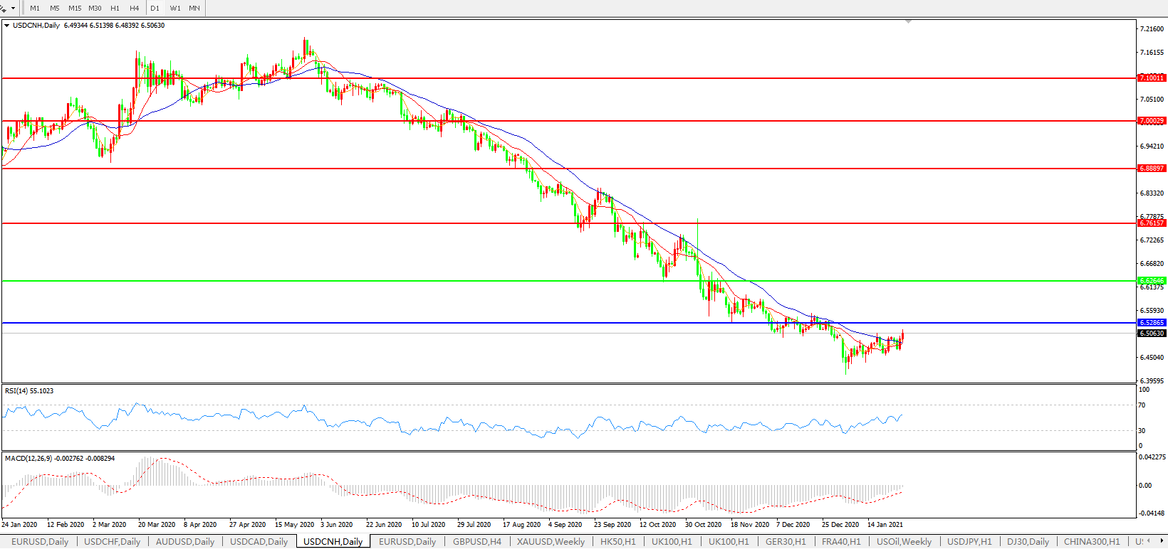 美元兑人民币USDCNH 日线图: