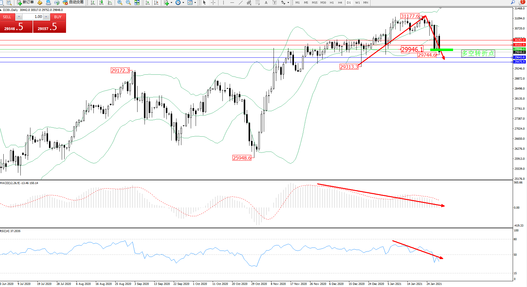 道琼斯指数1月29日(周五)收盘下跌620.70点,跌幅2.03%,报29982.68点。美股三大股指低开低走,美股追随全球股市跌势,全球股市也创下10月末以来最大下跌,部分原因是短线交易者大举购买被做空股票,引发对冲基金阵脚大乱、交易平台承压。日内交易者集体涌向被机构严重做空的股票,引发市场对于对冲基金将削减头寸的猜测GameStop Corp.和AMC Entertainment Holdings Inc.飙升,在网络聊天室中被热议的股票波动性陡增,因券商们表示,将开始放松此前由于本周波动剧烈而施加的交易限制。市场对不稳定的散户交易的担忧仍在持续,拖累美国股市走弱,虽然强生公司的Covid-19疫苗取得了突破,减轻了人们对消费恶化的担忧,但很明显的是需求形势仍然不温不火。