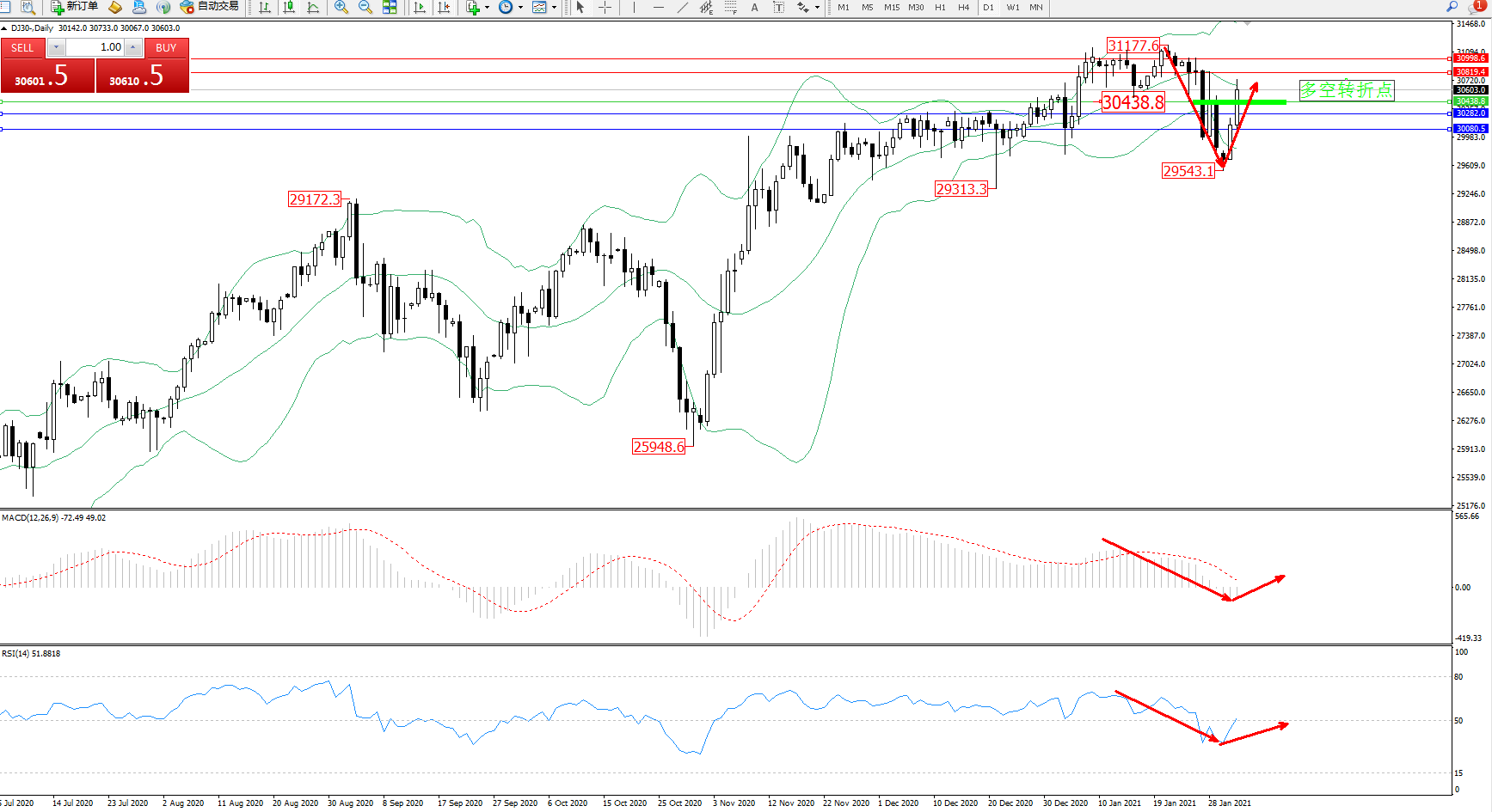技术点评:高位空头动力急速震荡下行至29543位置后得到支撑快速回升,触及布林带指标通道中轨附近节点后有进一步回升态势,布林带指标呈张口走势后开始缓慢收口,关注中轨下方附近转折点,MACD指标处于处于0轴线下方空头区域维持整理平移中,RSI指标处于50均衡线附近维持震荡后有回升迹象;