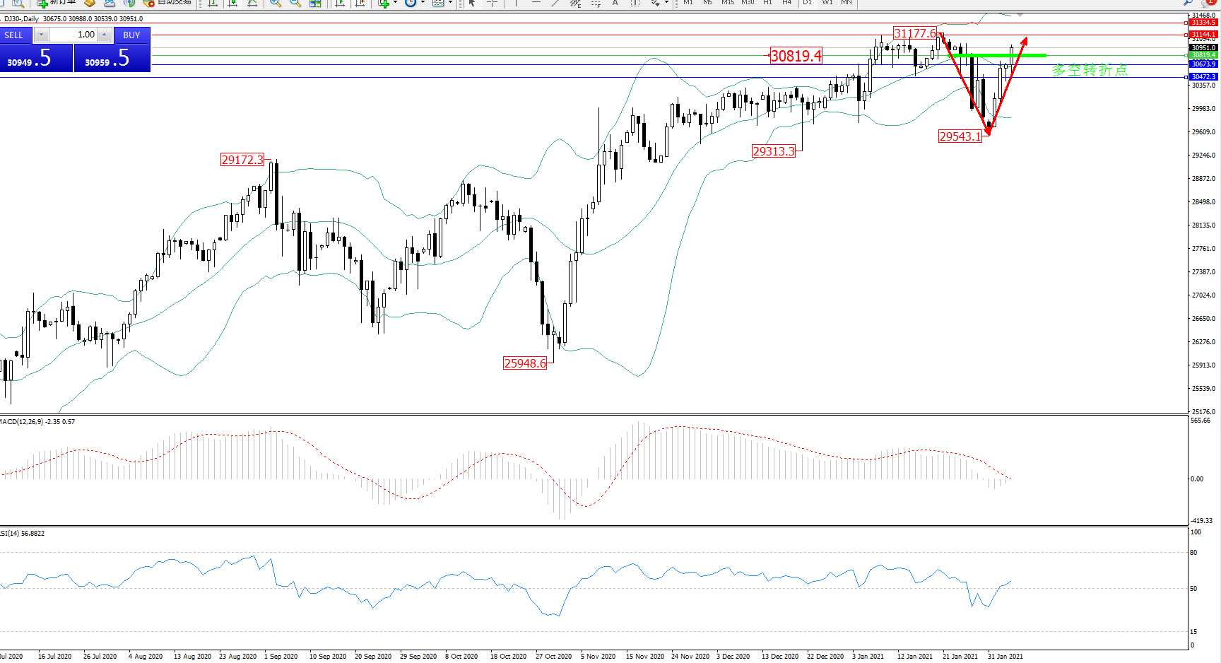 技术点评:高位空头动力急速震荡回撤至29543位置节点后,多头动力强势入场呈V型反转拉升上扬至布林带指标通道中上轨区间震荡,多头有继续向上移动态势,布林带指标呈张口走势后开始缓慢收口走平,关注中轨上方节点,MACD指标空头动力下行至0轴线下侧后得到支撑开始维持整理平移,RSI指标处于50均衡线附近震荡向上移动中;
