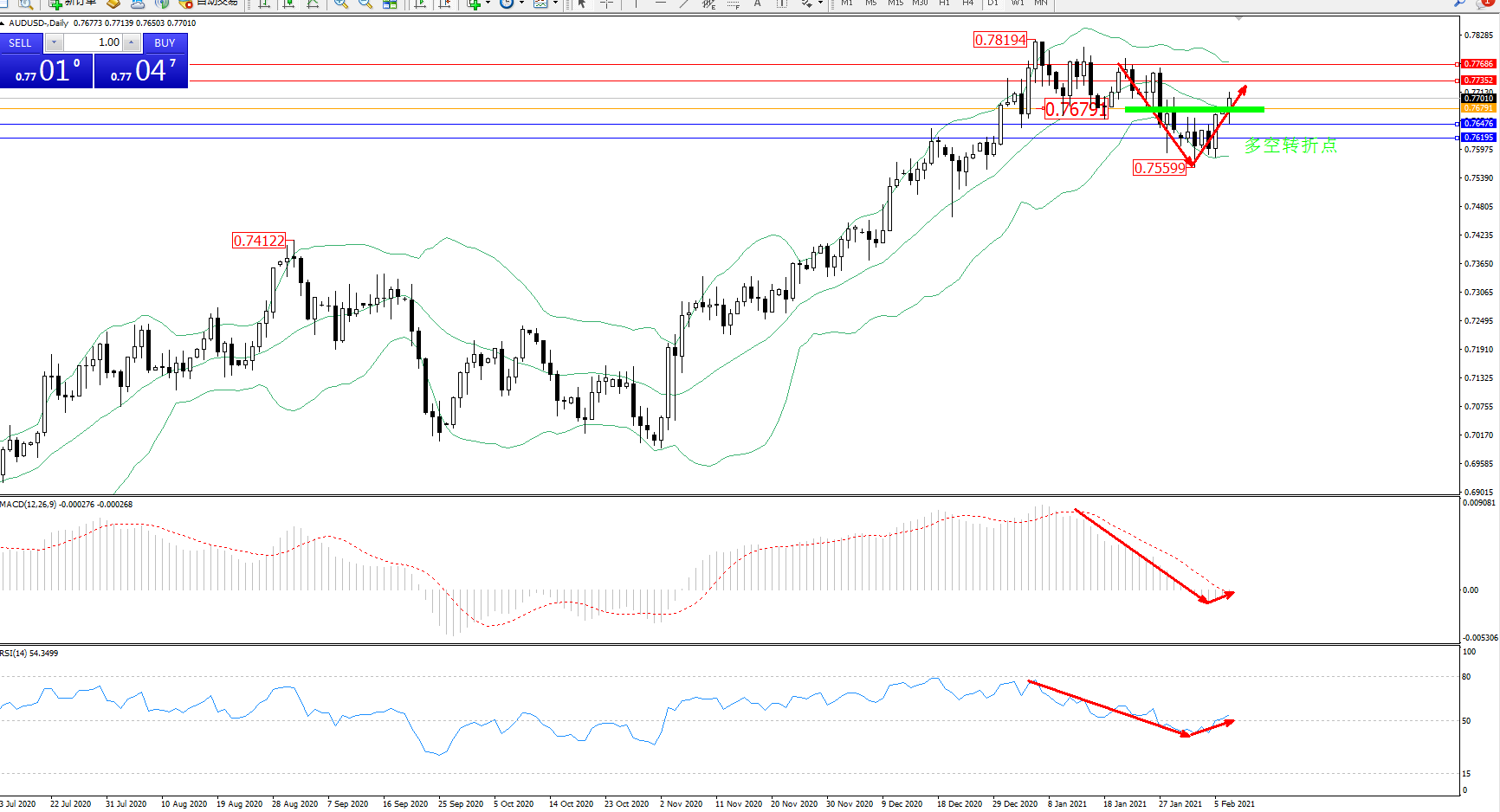 交易策略:0.76791上方看涨,目标0.77352、0.77686