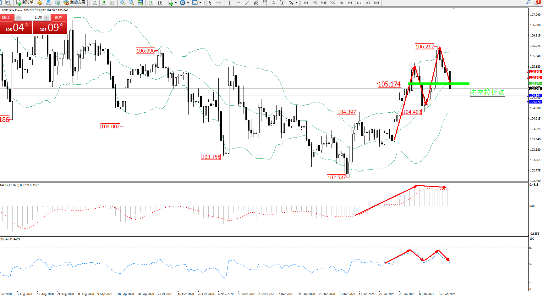 技术点评:多头动力延续布林带指标通道中上轨区间持续震荡上扬后,高位抵达106.212位置遇阻回撤下行,触及布林带指标中轨附近节点破位后有进一步向下移动态势,空头动力短期或将持续,MACD指标处于多头区域高位持续整理平移中,RSI指标处于多头区域维持震荡回撤,即将触及50均衡线附近节点;