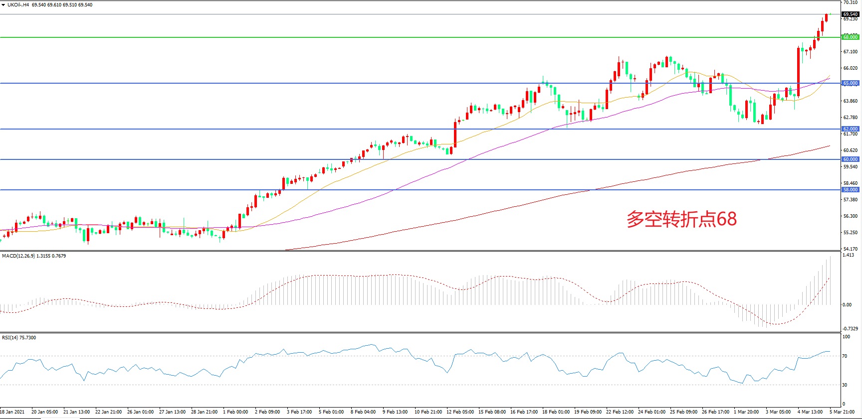 4小时图看,油价长阳连续拉升,多头趋势十分明显,68美元阻力被突破,短期均线长拐头向上,形成金叉,MACD红柱增加,RSI指标向上,日内延续上行概率较大。