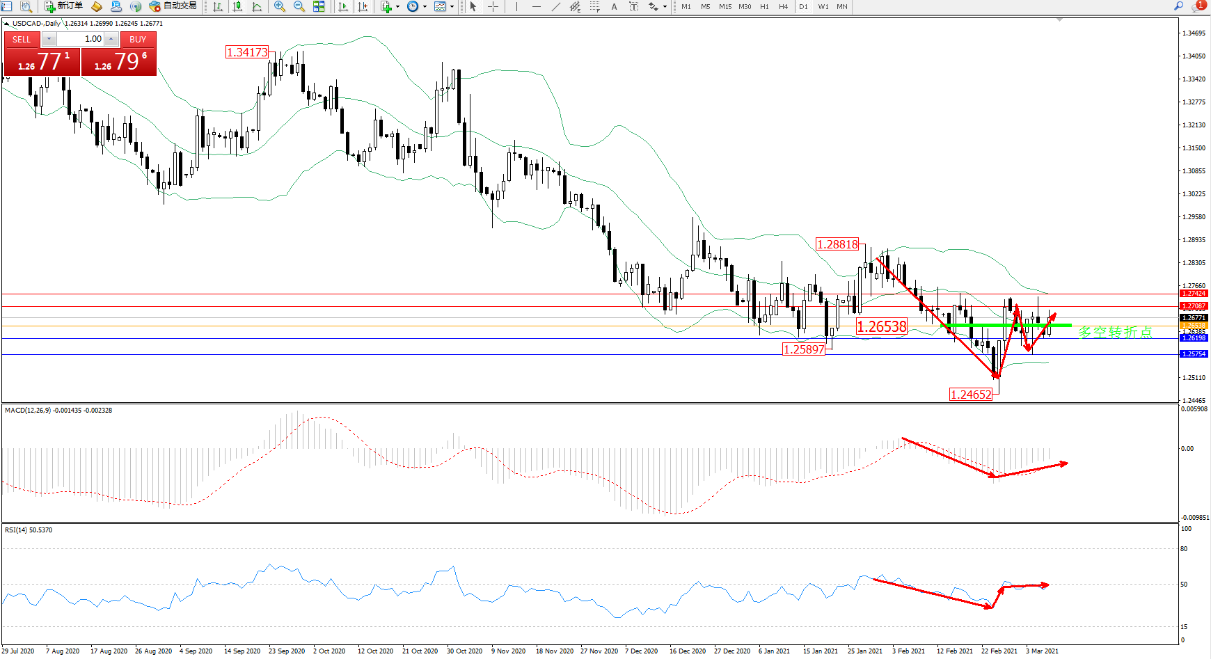 技术点评:空头动力延续布林带指标通道中下轨区间持续震荡下行,低位抵达1.24652位置后得到支撑强势反转上扬,突破布林带指标中轨附近节点后开始维持在中轨附近来回宽幅震荡中,多头动力有继续向上回升态势,布林带指标呈张口走势后开始收口平移,关注中轨附近节点,MACD指标处于空头区域低位维持震荡向上移动中,RSI指标处于50均衡线附近维持窄幅整理平移中;