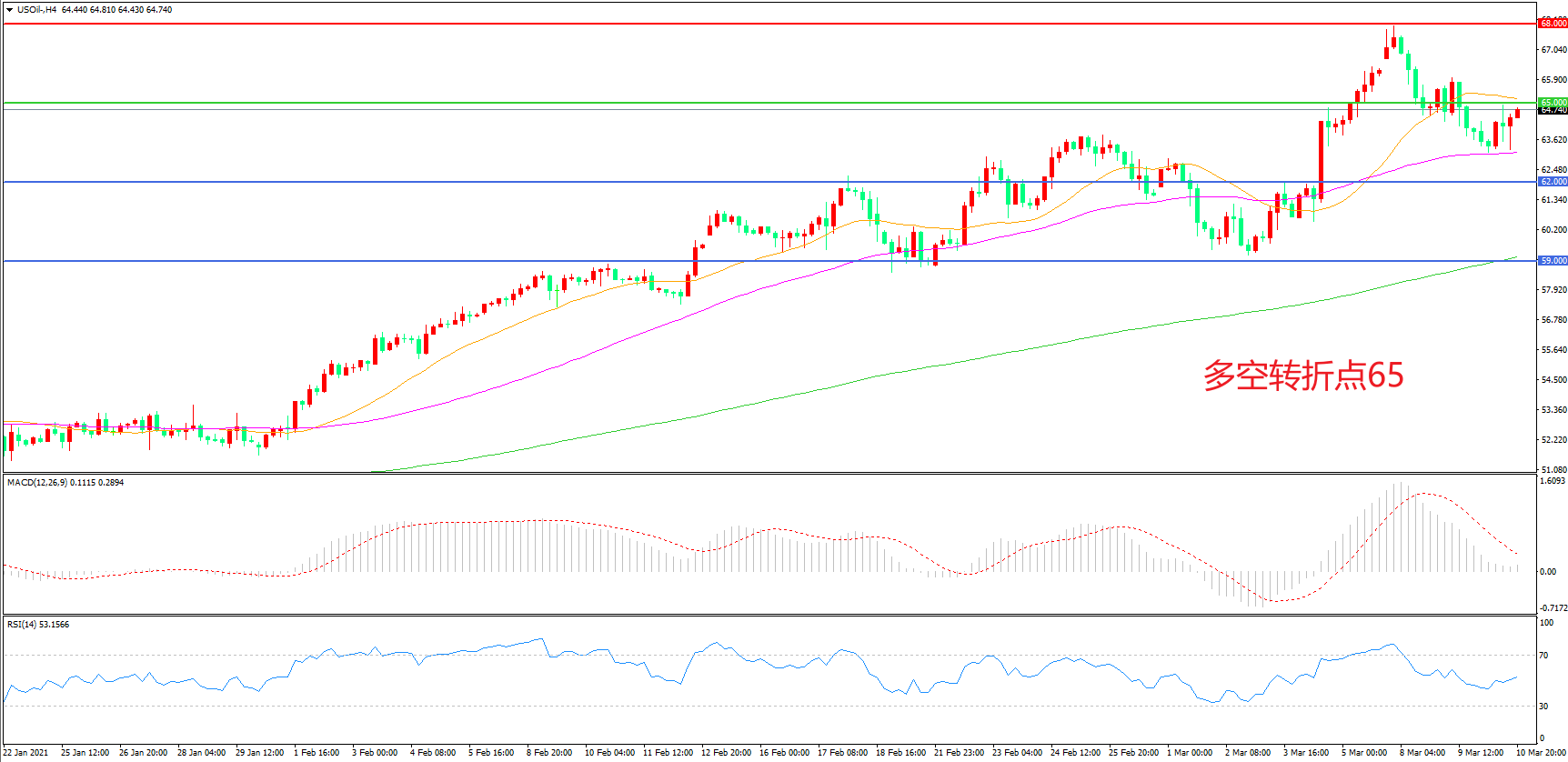 4小时图看,油价触碰68美元后震荡回落,短期走势陷入调整,55周期均线成为下方支撑,65美元成为多空分水岭,MACD红柱缩短,RSI指标走平,日内延续震荡概率较大。