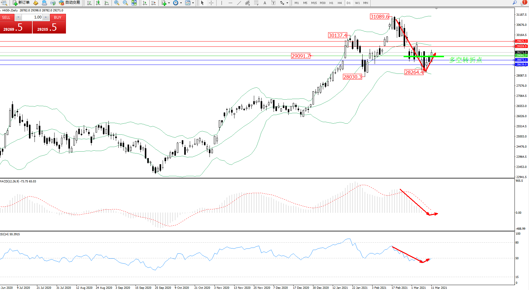 技术点评:高位空头动力维持震荡下行,触及布林带指标下轨28264附近节点附近得到短暂支撑,多头动力伺机入场,纠结于中下轨区间持续震荡走势缓慢上移中,布林带指标呈张口走势持续中,短期或将维持整理态势,MACD指标多头区域维持震荡下行走势纠结于0轴线下方维持弱势整理,RSI指标处于50均衡线下侧弱势徘徊后有上移迹象;