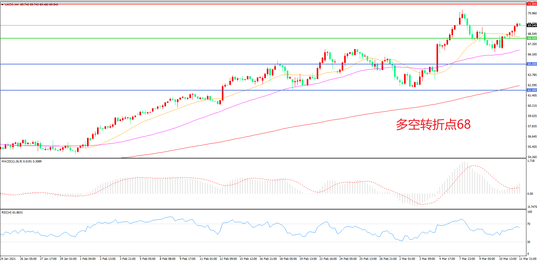 4小时图看,油价回踩55周期均线后震荡反弹,短期走势有所回暖,68美元成为下方支撑,72美元成为短期阻力,MACD红柱缩短,RSI指标走平,日内震荡上行概率较大。