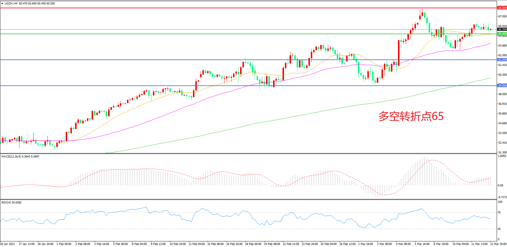 4小时图看,油价回踩55周期均线后震荡反弹,短期走势陷入震荡,65美元成为下方支撑,68美元成为短期阻力,MACD红柱缩短,RSI指标走平,日内延续震荡概率较大。