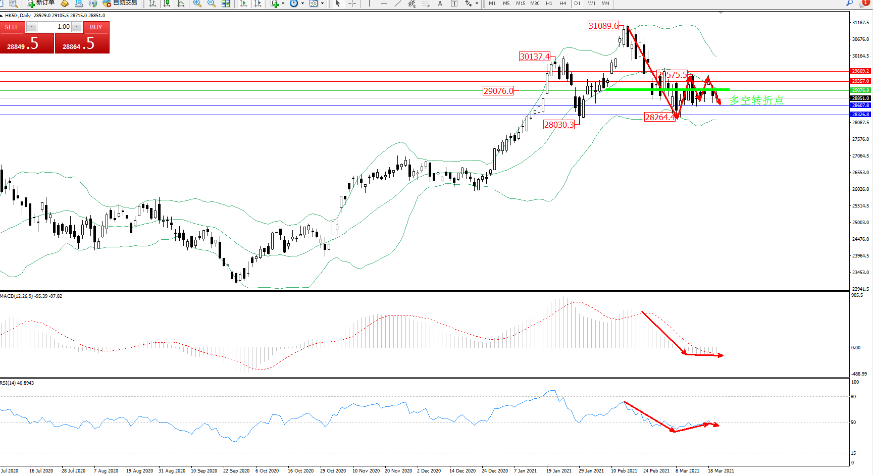 交易策略:29076下方看跌,目标28607、28326