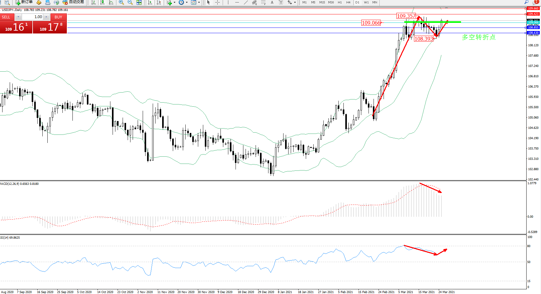 技术点评:多头动力延续布林带指标上轨附近持续震荡上扬,高位抵达109.357附近遇阻开始震荡回撤,缓慢回调至中轨附近节点后得到支撑再次向上移动,多头动力有进一步向上拉升态势,布林带指标呈收口走势向上移动态势良好,MACD指标处于多头区域高位整理缓慢向下移动中,RSI指标处于多头区域缓慢整理下移后反转向上移动;