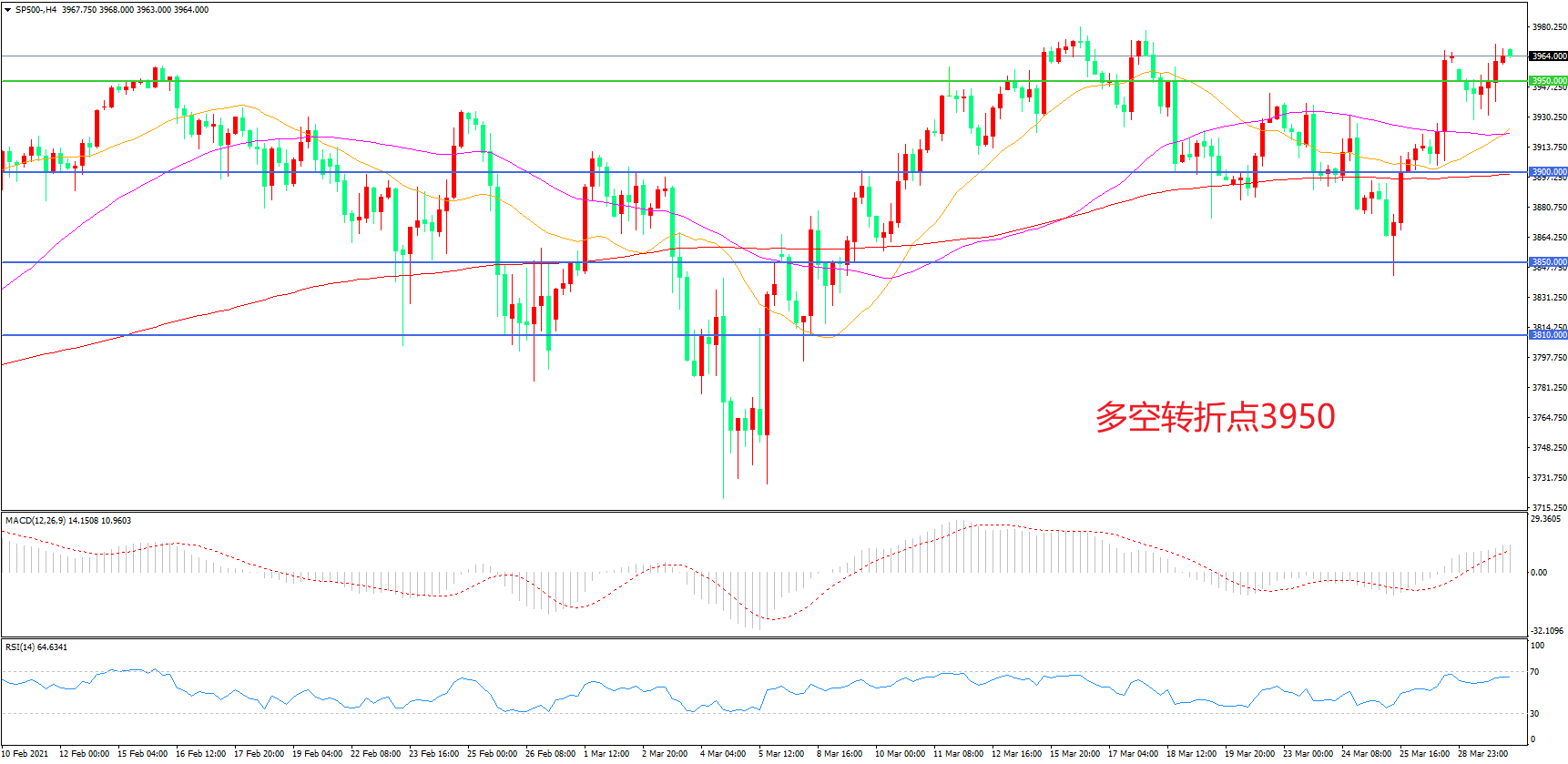 4小时图看,标普500先跌后涨,短期走势偏强,55周期均线成为短期支撑,3950成为多空分水岭,MACD红柱增加,RSI指标走平,日内震荡上行概率较大。