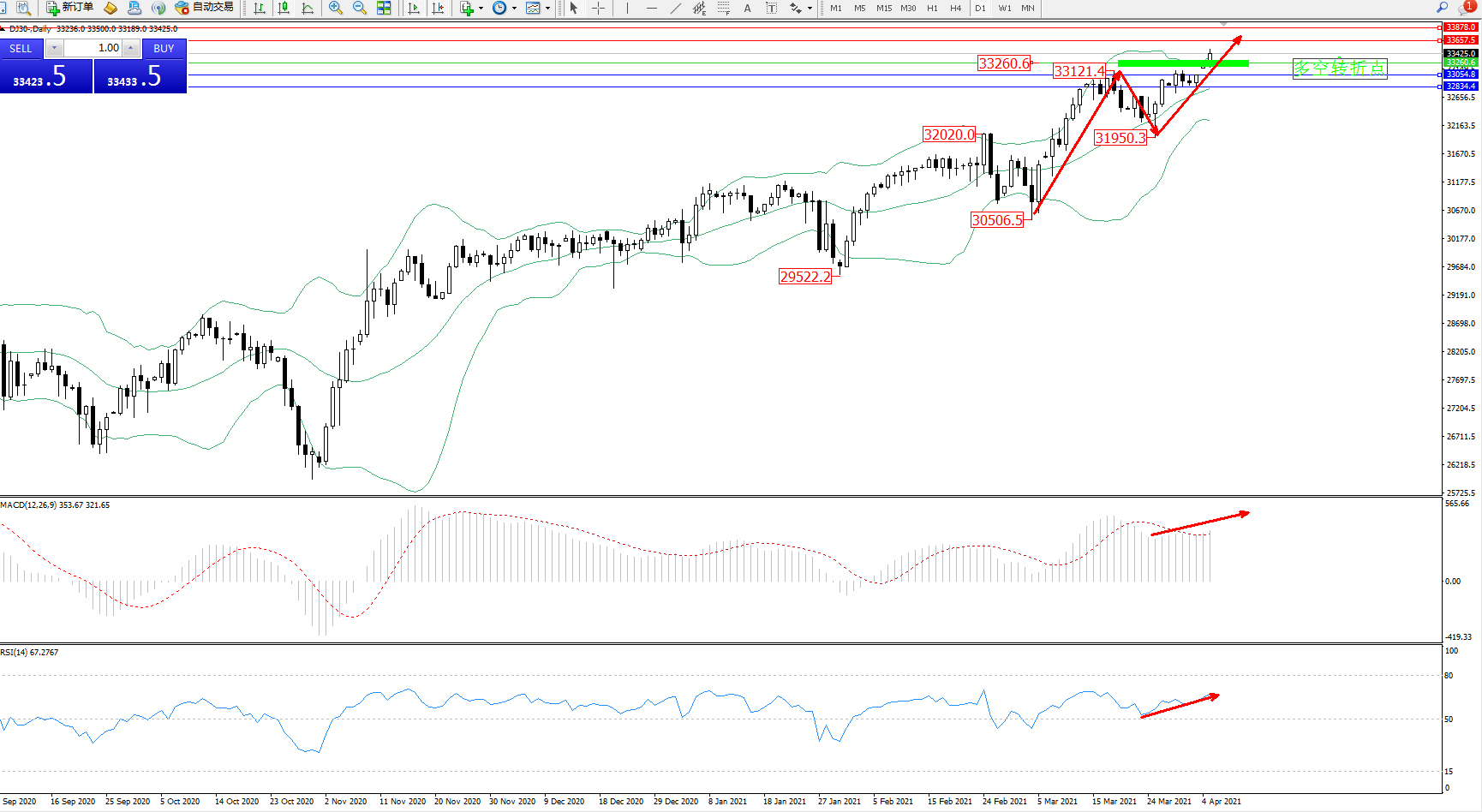 道琼斯指数4月5日(周一)收盘上涨373.98点,涨幅1.13%,报33527.19点;美股收盘,道指再创新高,因美国公布强劲的就业和服务业数据后,市场普遍对美国经济复苏持乐观态度,美国总统拜登宣布了人们期待已久的逾2万亿美元的就业计划,这引发了通胀担忧;现在距离充分就业还有很长一段路,通货膨胀不太可能长期维持在预期水平;建议在0.95%的收益率水平做多国债;鉴于美联储的升息条件以及第一次加息前需完成的一系列事件,认为市场对美联储到2022年第四季度前加息一次,2023年年末前加息近四次的预测过于激进;美联储不太可能暗示减码宽松政策,而这种暗示将是实现货币政策正常化的第一步,除非在更广泛的指标上取得实质性进展;投资者关注美联储将于周三公布的上次政策会议记录。