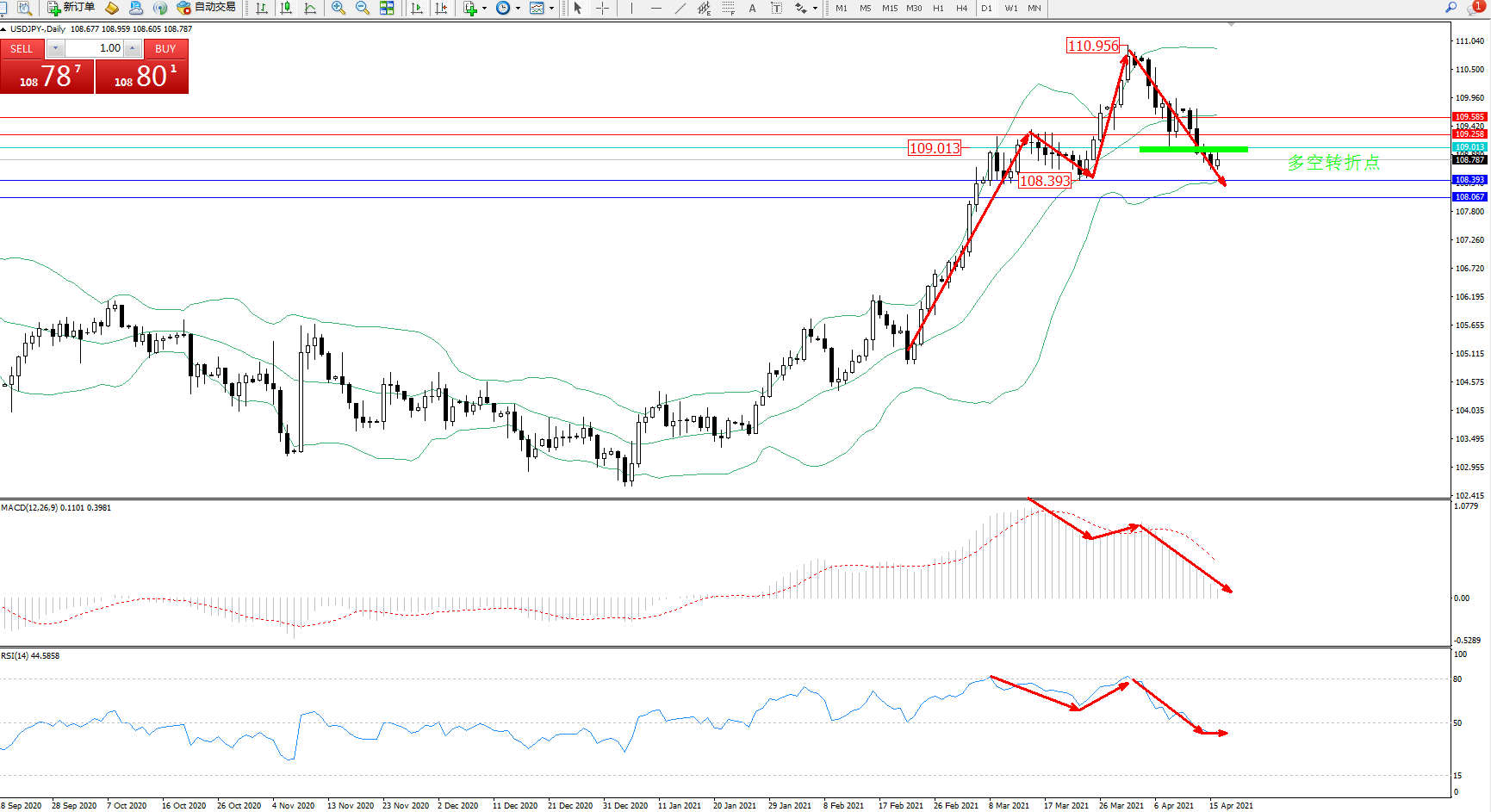 技术点评:多头动力延续布林带指标中上轨区间通道持续震荡上扬,高位抵达110.956位置遇阻回撤,跌破布林带指标中轨附近节点后维持宽幅震荡,空头动力依旧有继续下行迹象,布林带指标呈张口走势后开始缓慢收口,关注中轨附近节点,MACD指标处于多头区域高位震荡回撤,RSI指标高位持续回撤下行跌破0轴线进入空头区域继续下移;