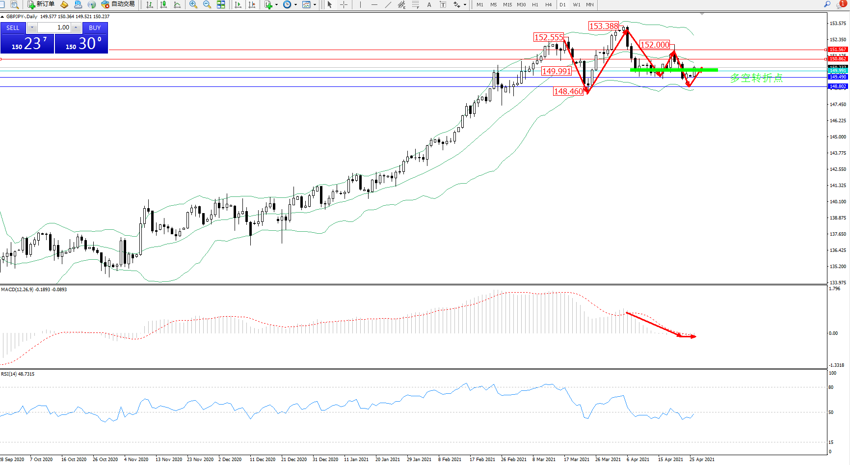 英镑兑日圆处于150.267附近弱势震荡,近期英国公布的经济数据表现良好。随着经济从封锁中恢复,以及令人鼓舞的疫苗大规模推出增加了更光明的前景,在超过23年的采购经理人指数历史上, 由于英国新冠病毒疫苗免疫接种速度较快,因此对新冠病毒大流行的限制更为宽松,促使私营部门企业增长录得2013年底以来最快增速。随着对病毒的限制进一步放宽,商业活动在5月和6月将继续强劲增长,为第二季度的经济增长奠定基础。英国脱欧后未实施当时艰难设立的《北爱尔兰议定书》,与欧盟的紧张关系升级,打压英经济。