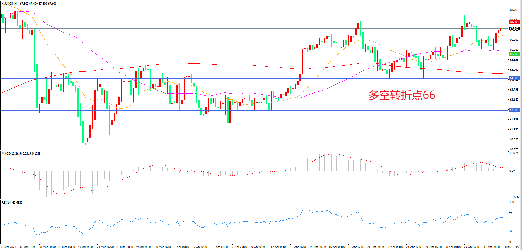 周一(5月3日),因中国的经济数据表现强劲和美国的疫苗接种率预示着这两大经济体的原油需求将会强劲反弹,市场风险情绪大幅回升,布伦特原油大幅上涨,收报67.60美元/桶。目前油市后市的逻辑依旧是需求,因为供应起码在今年内,都是可控的,中东地缘政治冲突、大国博弈、美国对伊朗制裁放开的节奏都会对未来油价的走势产生影响。