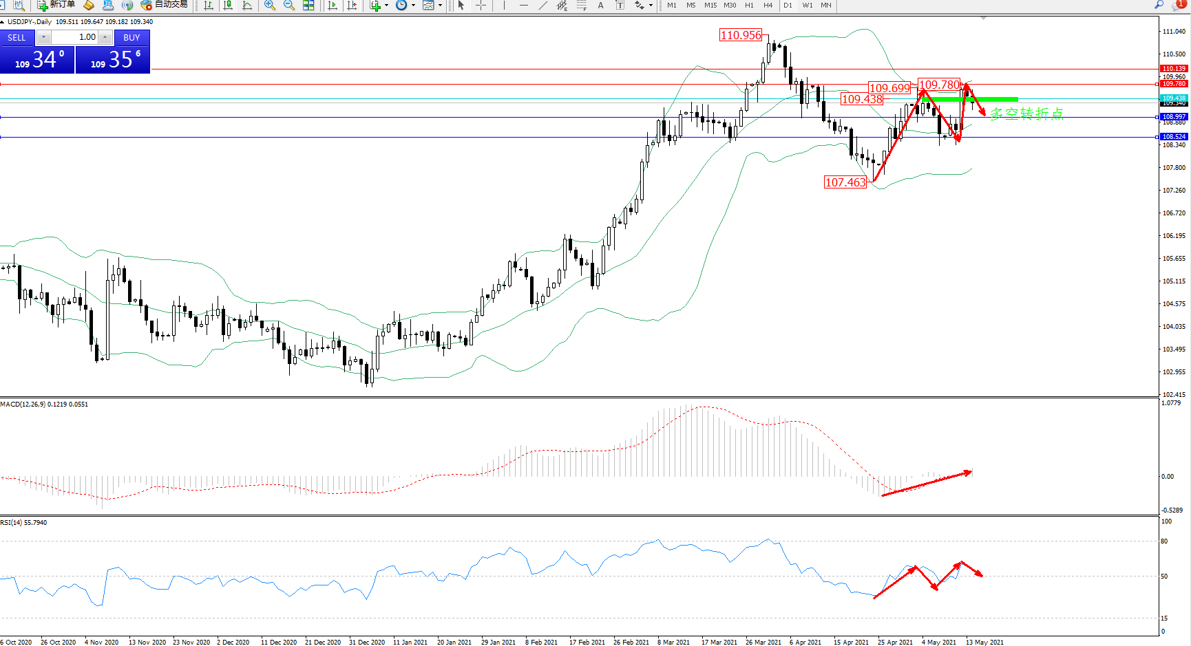 技术点评:低位多头动力持续震荡上扬,高位抵达布林带指标上轨附近109.780节点后遇阻回撤,中上轨区间持续调整中,布林带指标呈缓慢收口走势平移后有继续徘徊迹象,MACD指标处于0轴线上方弱势徘徊中,RSI指标处于50均衡线上方维持窄幅震荡;