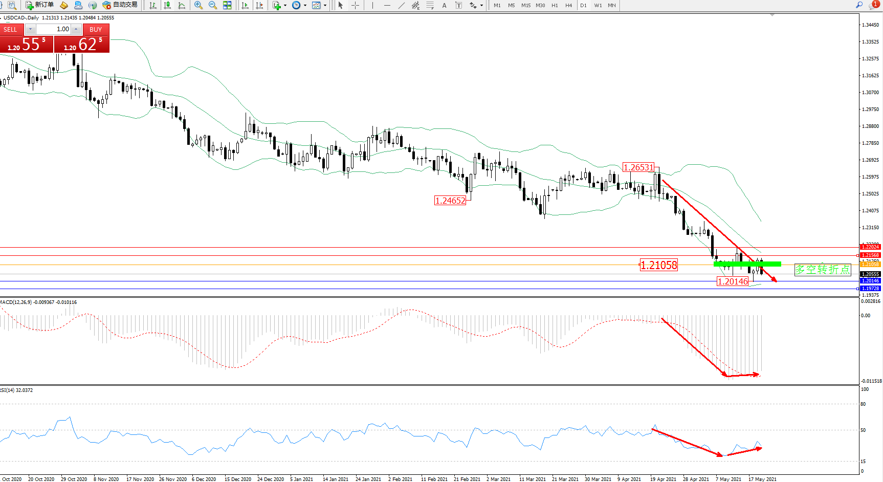 交易策略:1.21058下方看跌,目标1.20146、1.19728