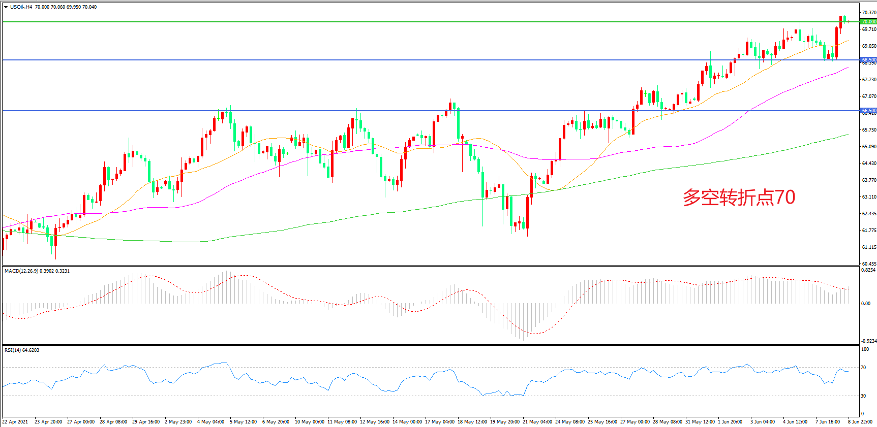 4小时图看,油价长阳拉升,表现强劲,72美元成为短期多空分水岭,均线系统呈多头排列,MACD红柱增加,日内上行概率较大。