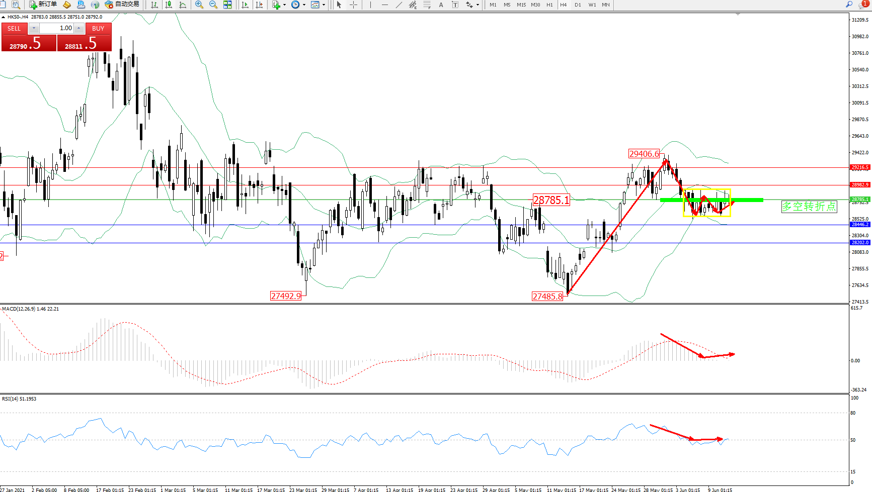 技术点评:低位多头动力持续震荡上扬至布林带指标上轨29406附近遇阻整理,短期徘徊后空头动力伺机入场反转下行,触及布林带指标下轨附近节点后得到短暂支撑开始震荡,布林带指标呈收口走势后有张口迹象,关注中下轨区间节点,短期空头或有进一步调整下行迹象,MACD指标处于0轴线上方多头区域维持整理向下移动,RSI指标处于多头区域维持窄幅震荡后跌破50均衡线进入空头动力弱势徘徊;