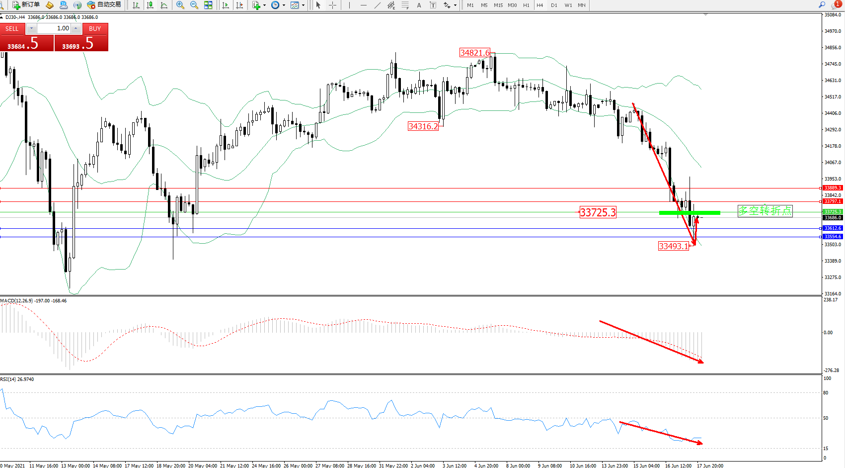 交易策略:33725下方看跌,目标33612、33554