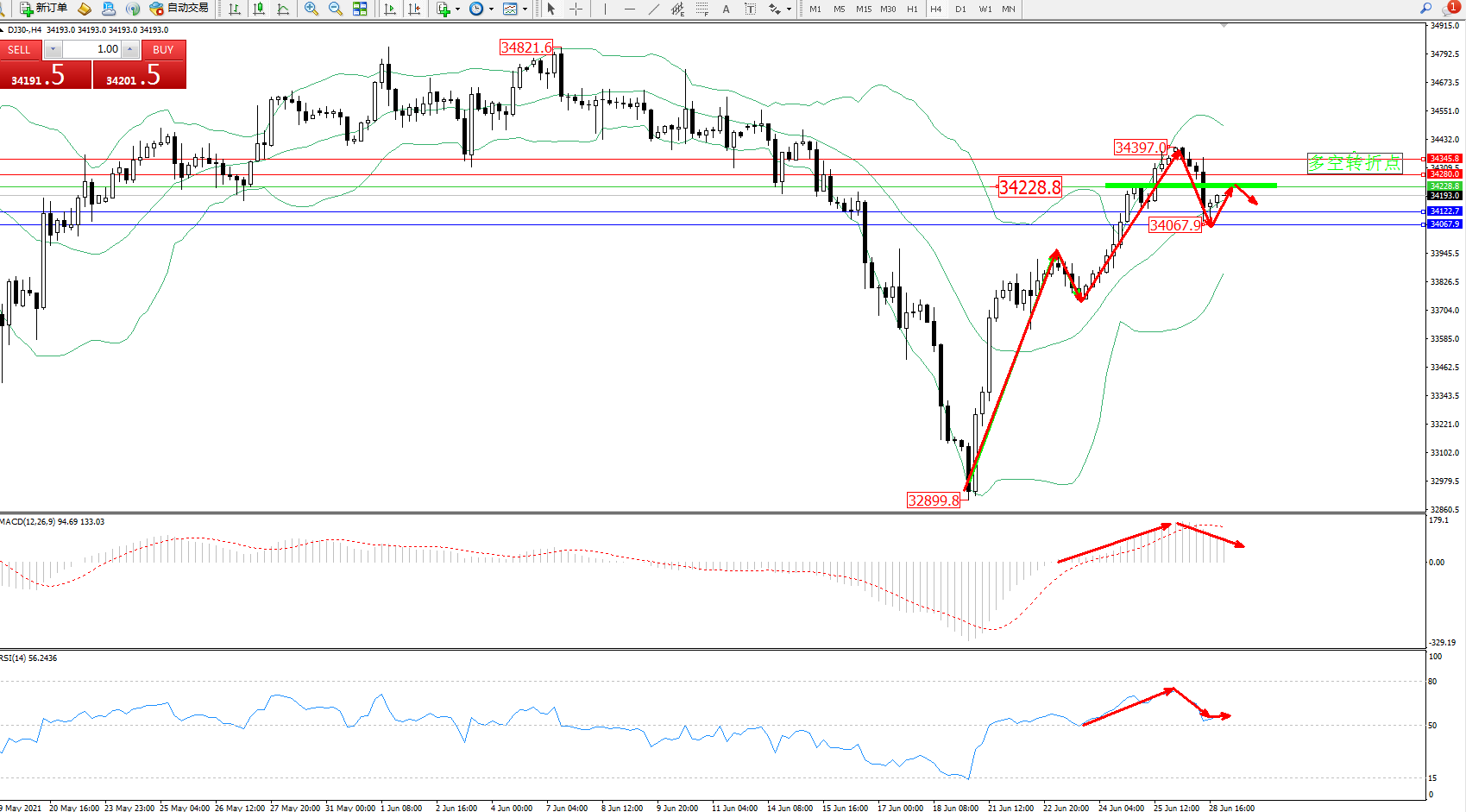 技术点评:低位多头动力持续震荡上扬,高位抵达34397位置后遇阻,开始反转下行,跌至布林带指标中轨附近节点后短暂上移,但高位反转下行趋势即将形成,布林带指标呈收口走势中,关注中轨上側附近节点,MACD指标处于多头区域高位维持整理后有缓慢下行迹象,RSI指标处于多头区域高位震荡回撤,纠结于50均衡线上方弱势徘徊中;