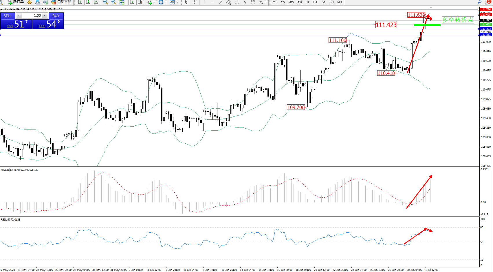 技术点评:多头动力延续布林带指标上轨附近持续拉升中,高位抵达111.628位置后短期遇阻整理,布林带指标呈张口走势持续中,MACD指标处于多头区域持续拉升走势态势良好,RSI指标处于多头区域维持高位震荡上移后有回撤迹象;