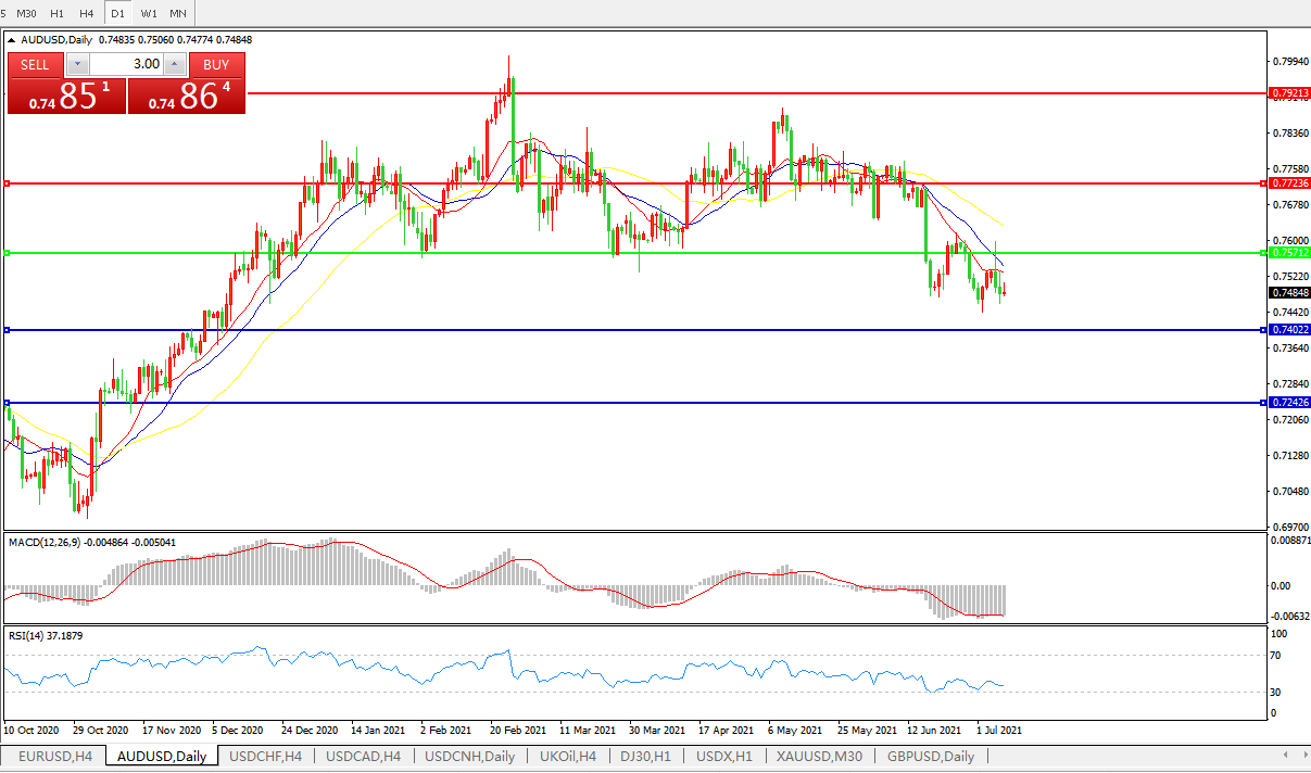 交易策略:0.7570下方看跌,目标0.7400、0.7240