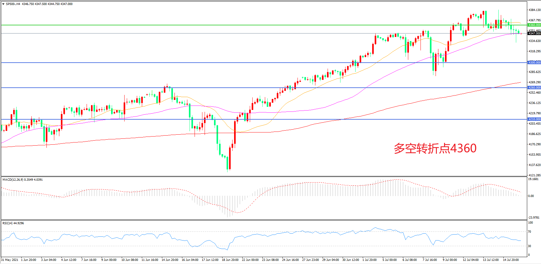 4小时图看,标普500冲高回落,短期升势暂缓,但上行形态依然完好,55均线成为中期支撑,4360成为多空分水岭,MACD红柱减少,RSI指标向下,日内震荡上行概率较大。