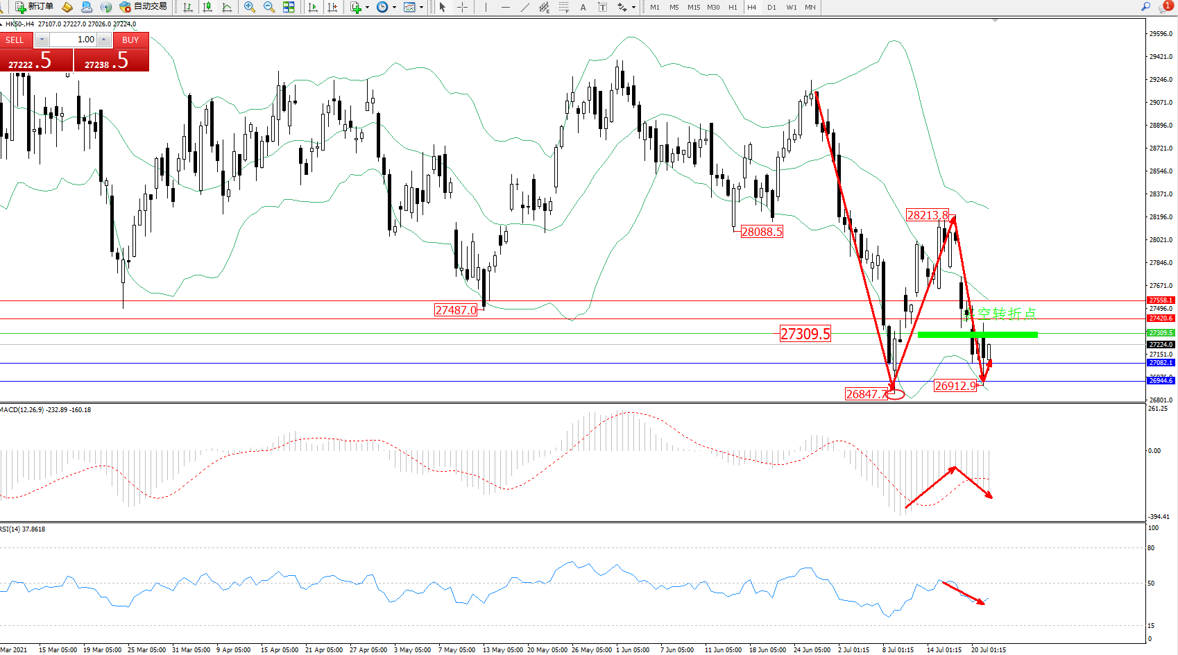 技术点评:空头动力延续布林带指标下轨附近持续下挫,低位抵达26847位置后拉升上扬,抵达26912位置后再度遇阻下挫,即将触及布林带指标下轨27082位置附近开始整理回升,短期空头动力仍有进一步向下移动态势,前期低位26847位置近在咫尺破位在即,布林带指标呈收口走势后开始有张口迹象,MACD指标处于空头区域短暂回升后再度下挫,RSI指标纠结于50均衡线附近整理后开始向下移动中;