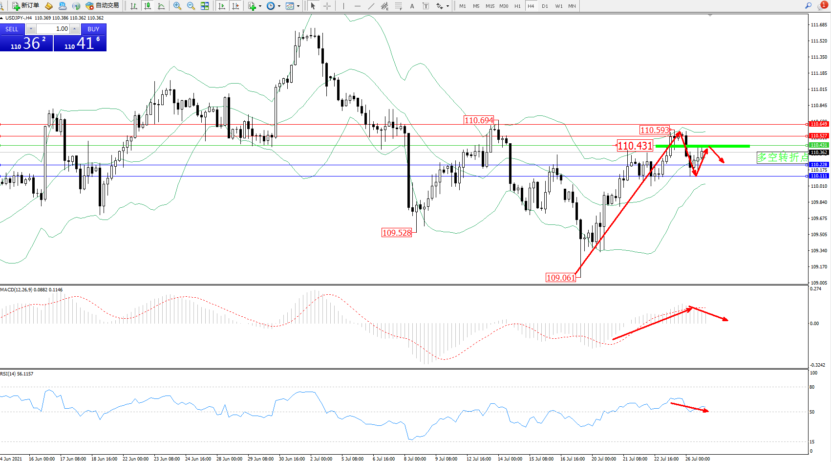 技术点评:低位多头动力持续震荡上扬,高位触及布林带指标上轨110.593位置附近后短暂遇阻回撤纠结于中轨附近再度震荡向上移动,但高位压制明显有增大迹象,布林带指标呈收口走势后开始有平移迹象,MACD指标处于多头区域持续震荡上移后开始平移,RSI指标处于多头区域维持窄幅整理;