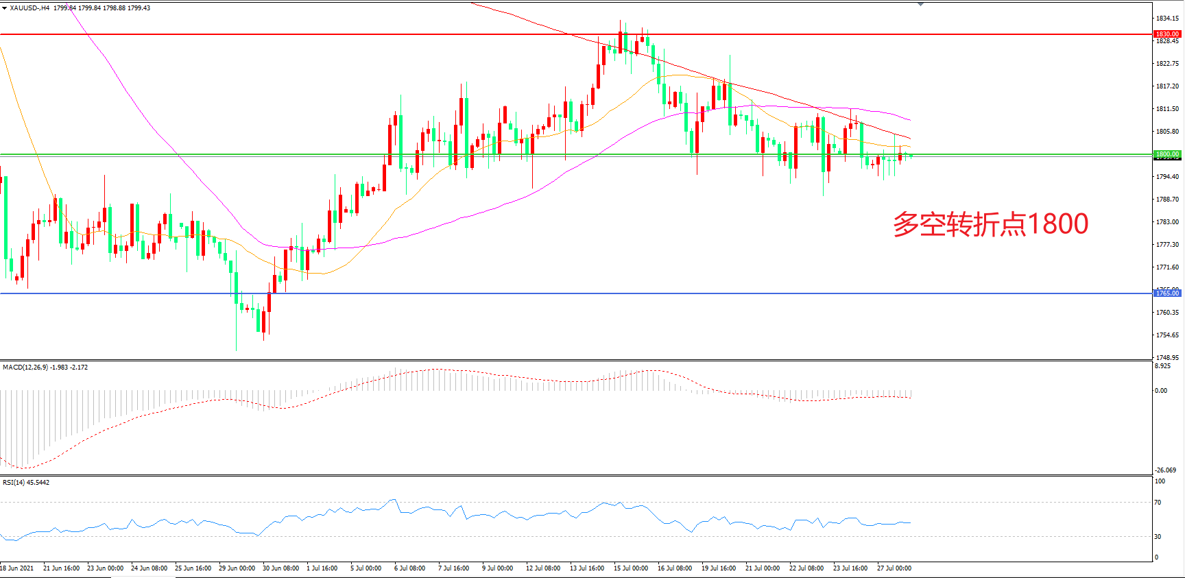 4小时图看,金价受制于均线系统压力小幅回落,弱势震荡迹象明显,1800成为多空分水岭,MACD绿柱缩短,RSI指标走平,日内窄幅震荡概率较大。