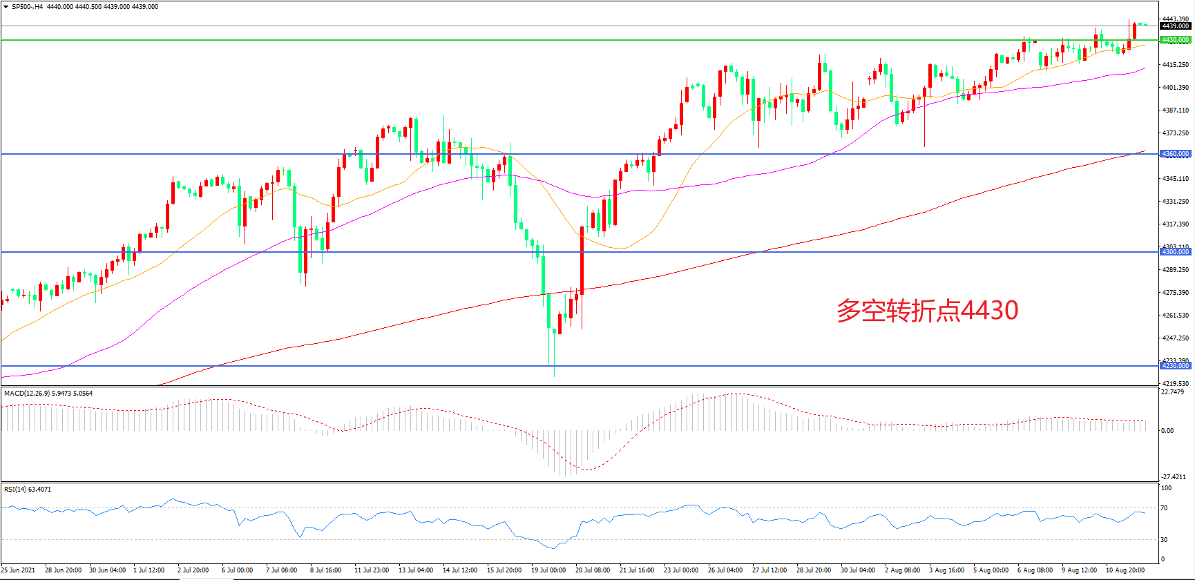 4小时图看,标普500以均线系统为支撑震荡上行,短期表现偏强,21周期均线成为下方支撑,4430成为多空分水岭,MACD红柱增加,RSI指标走平,日内震荡上行概率较大。