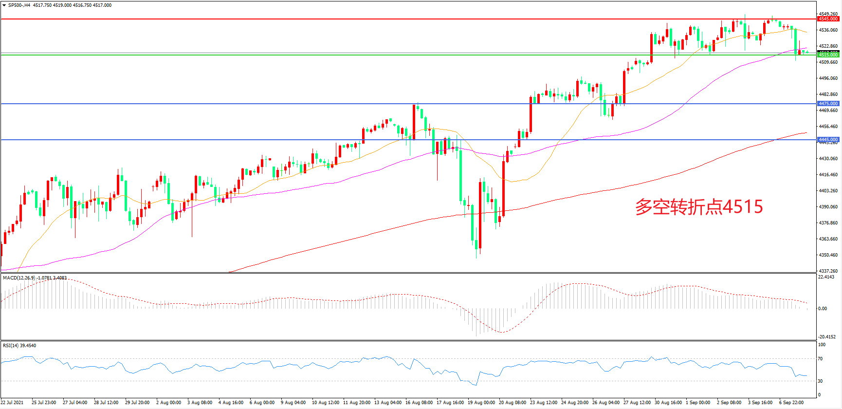4小时图看,标普500长阴下破,整体呈现区间震荡形态,4515成为下方支撑,4545成为上方阻力, MACD红柱缩短,RSI指标走平,日内延续震荡概率较大。