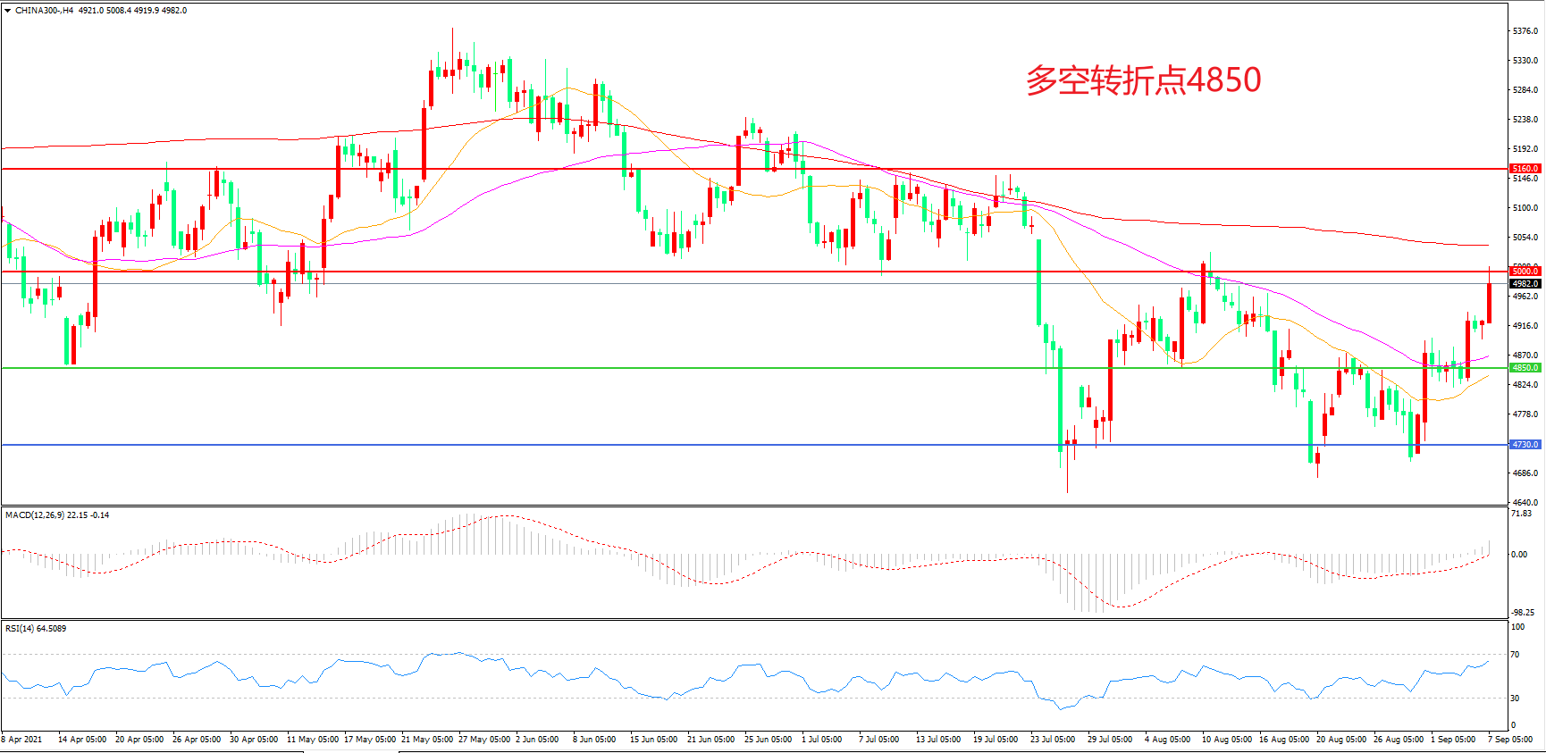 4小时图看,沪深300长阳拉升,整体走势偏强,21周期均线成为支撑,4850成为多空分水岭,MACD红柱增加,RSI指标走平,日内震荡上行概率较大。