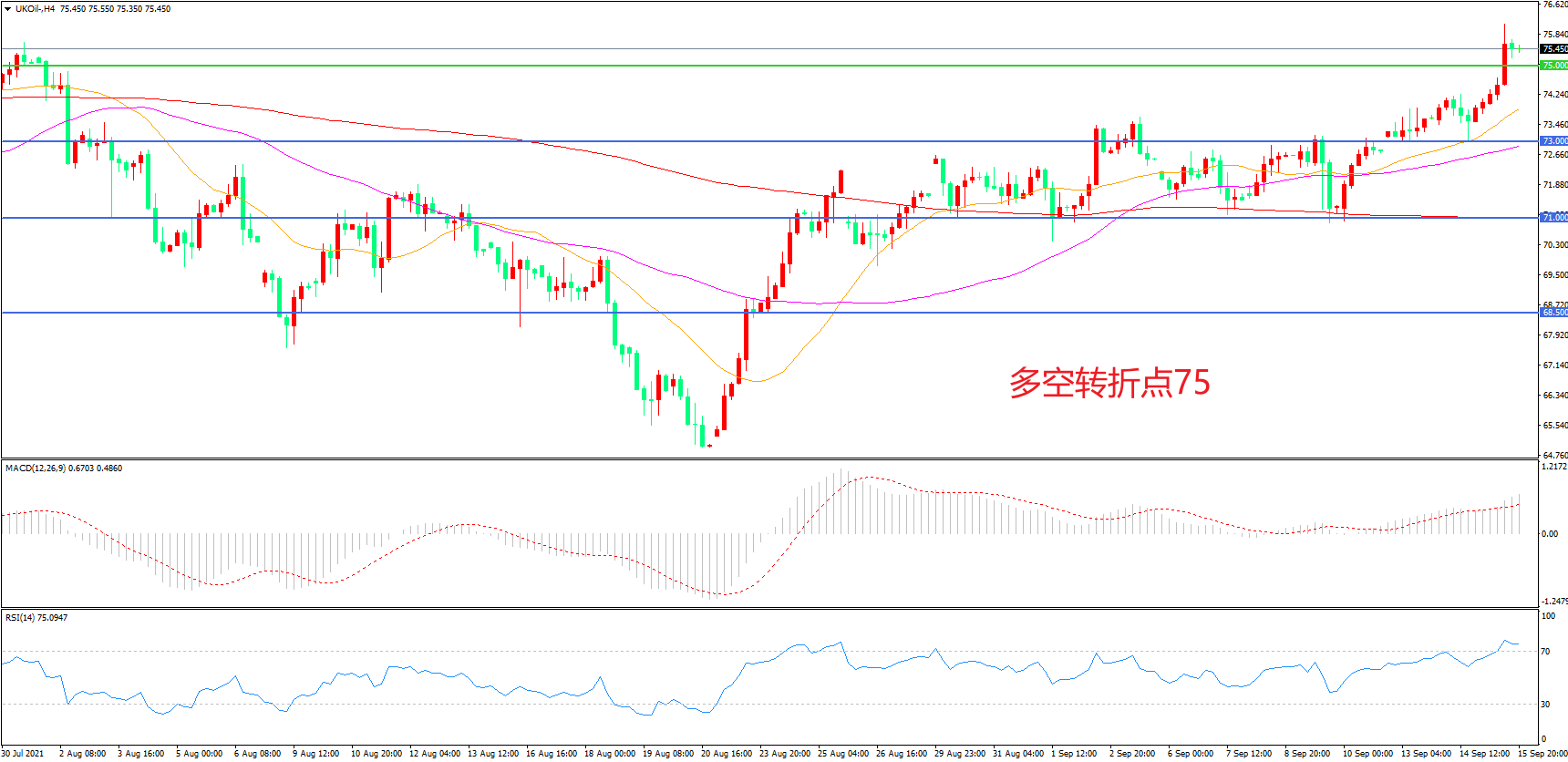 4小时图看,油价长阳拉升,强势突破前期阻力,短线走势偏强,均线系统呈多头排列,MACD红柱增加,日内震荡上行概率较大。