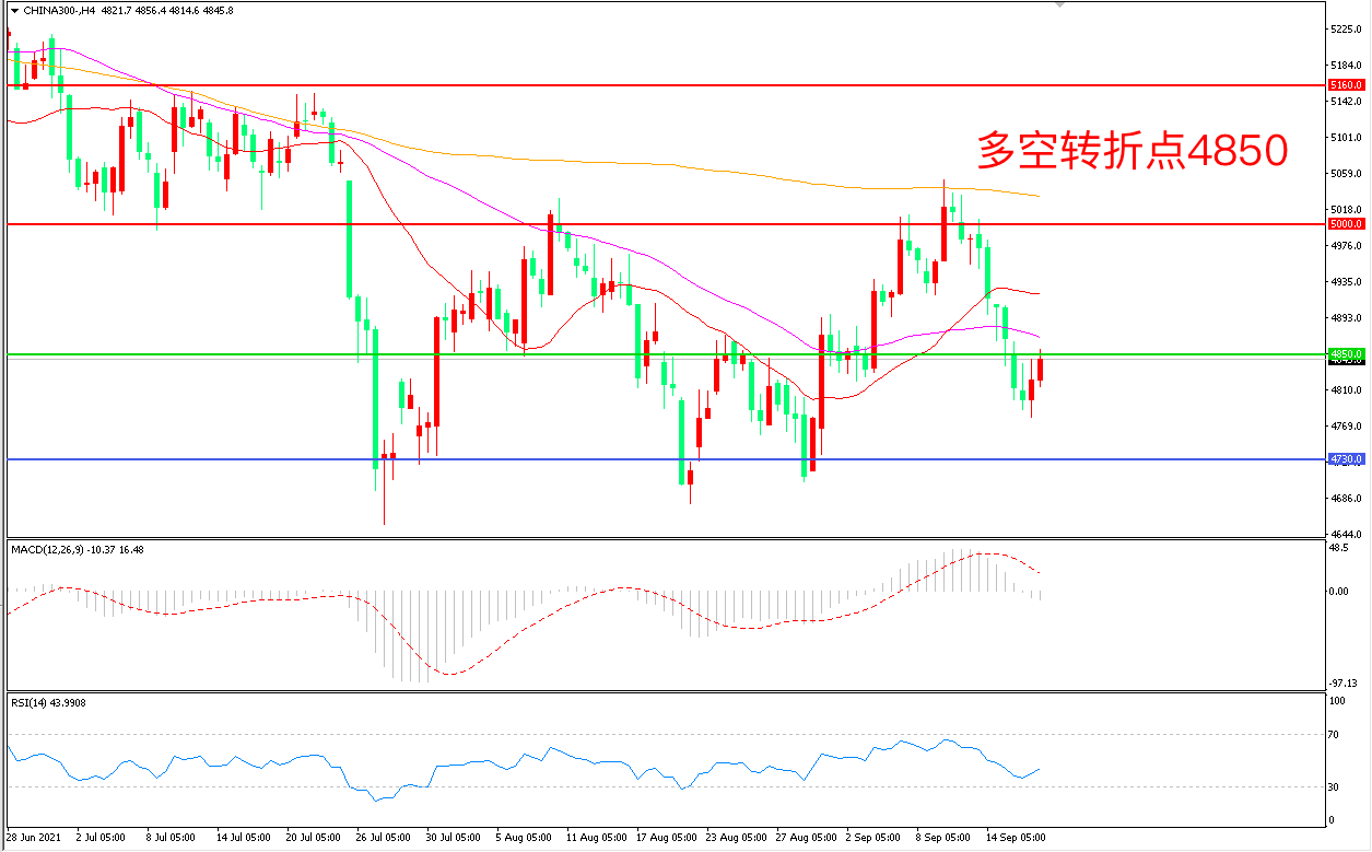 4小时图看,沪深300连续下跌后小幅反弹,短期行情有所回暖,均线系统成为阻力,MACD绿柱增加,RSI指标走平,日内延续震荡概率较大。
