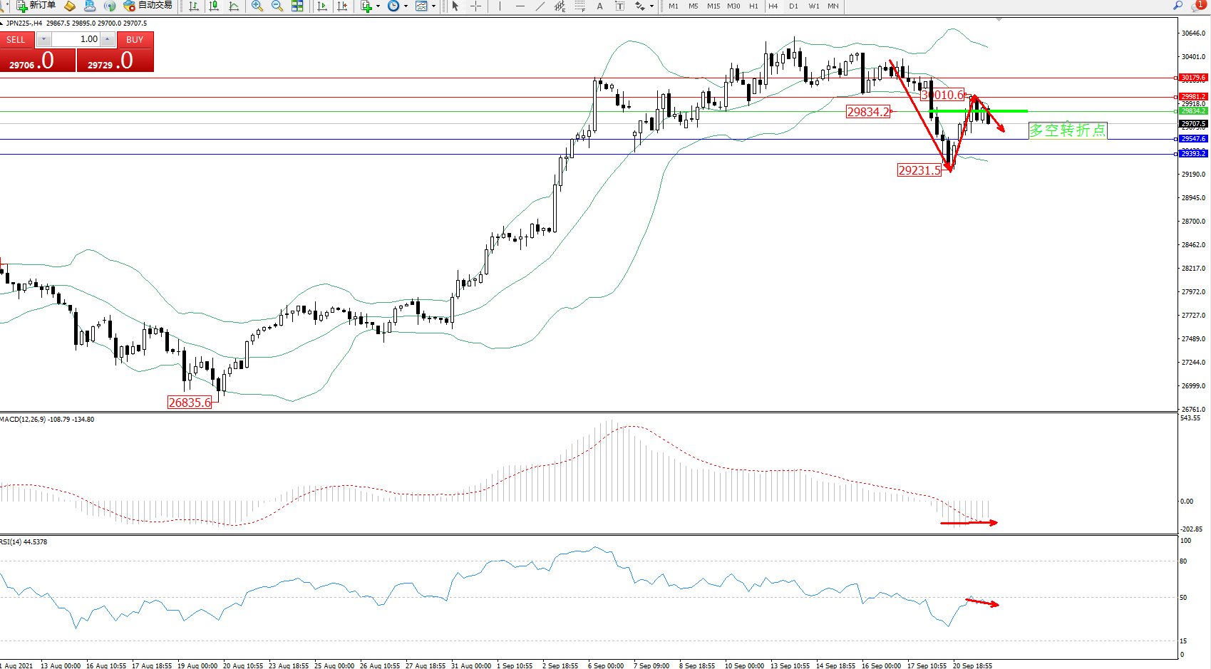 技术点评:空头动力延续布林带指标通道中下轨区间持续震荡下行,低位抵达29231位置后得到短暂支撑反转上移,纠结于中轨下方不断震荡中,布林带指标呈收口走势持续中,短期或维持弱势向下移动,MACD指标处于0轴线下方空头区域维持整理,RSI指标处于50均衡线下方维持弱势徘徊;