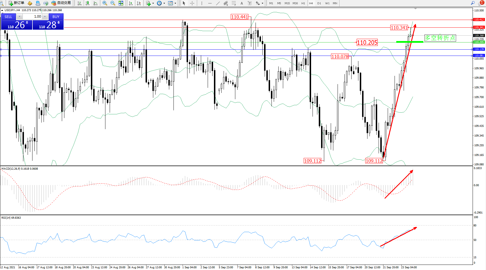 技术点评:低位多头动力强势拉升上扬,高位触及布林带指标上轨附近节点后不断攀升,且未见止步迹象,前期高位110.441位置近在咫尺,短期内或将有触及迹象,布林带指标呈张口走势中,MACD指标处于多头区域维持震荡上扬中,RSI指标处于多头区域维持整理整理不断上移;