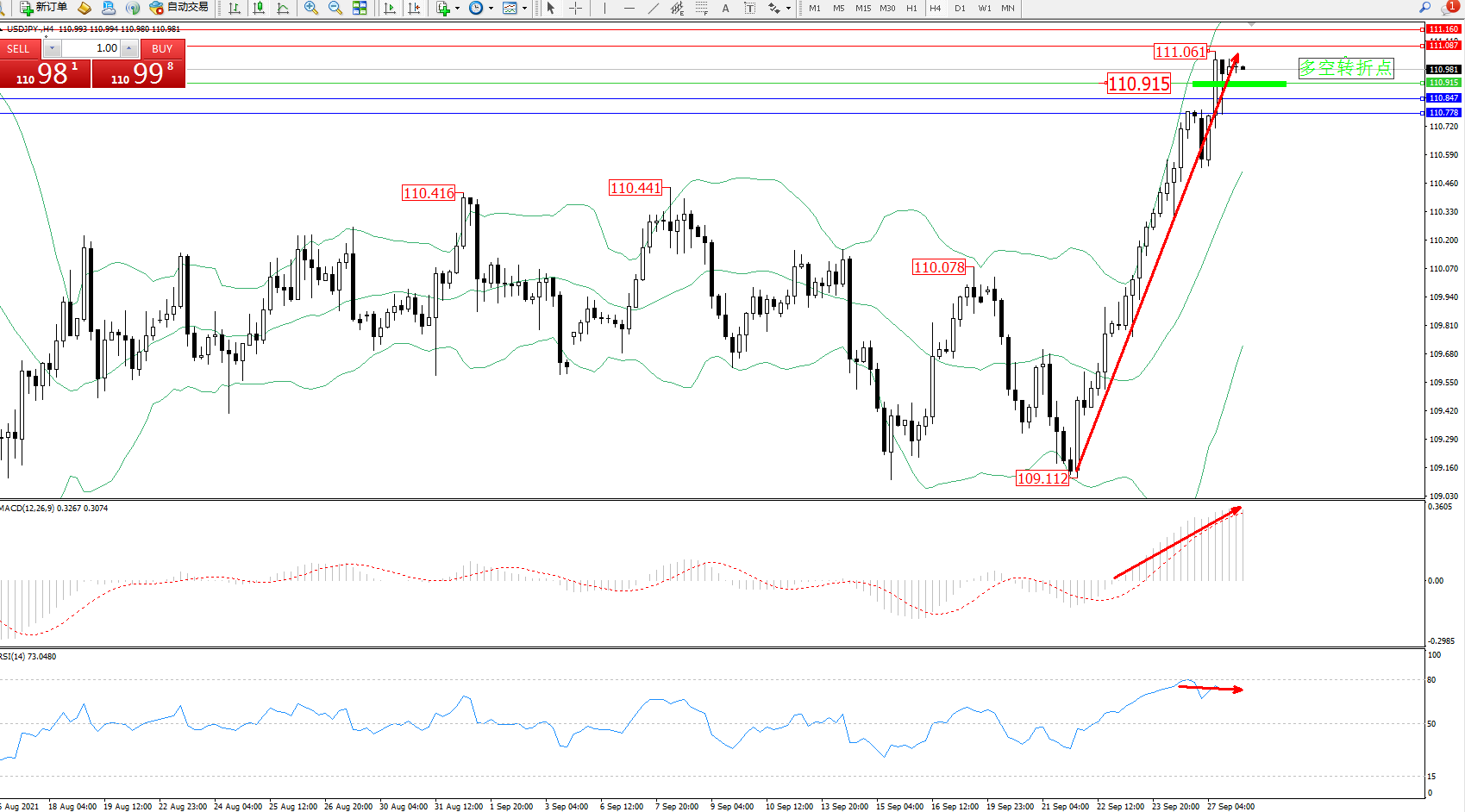 技术点评:多头动力延续布林带指标上轨附近强势拉升上扬,高位抵达111.061位置后开始短暂整理,多头动力有继续拉升上扬态势,且未出现最终止步迹象,布林带指标呈上行趋势走势持续中,MACD指标处于多头区域维持上移走势中,RSI指标处于高位80均衡线下方维持弱势徘徊;
