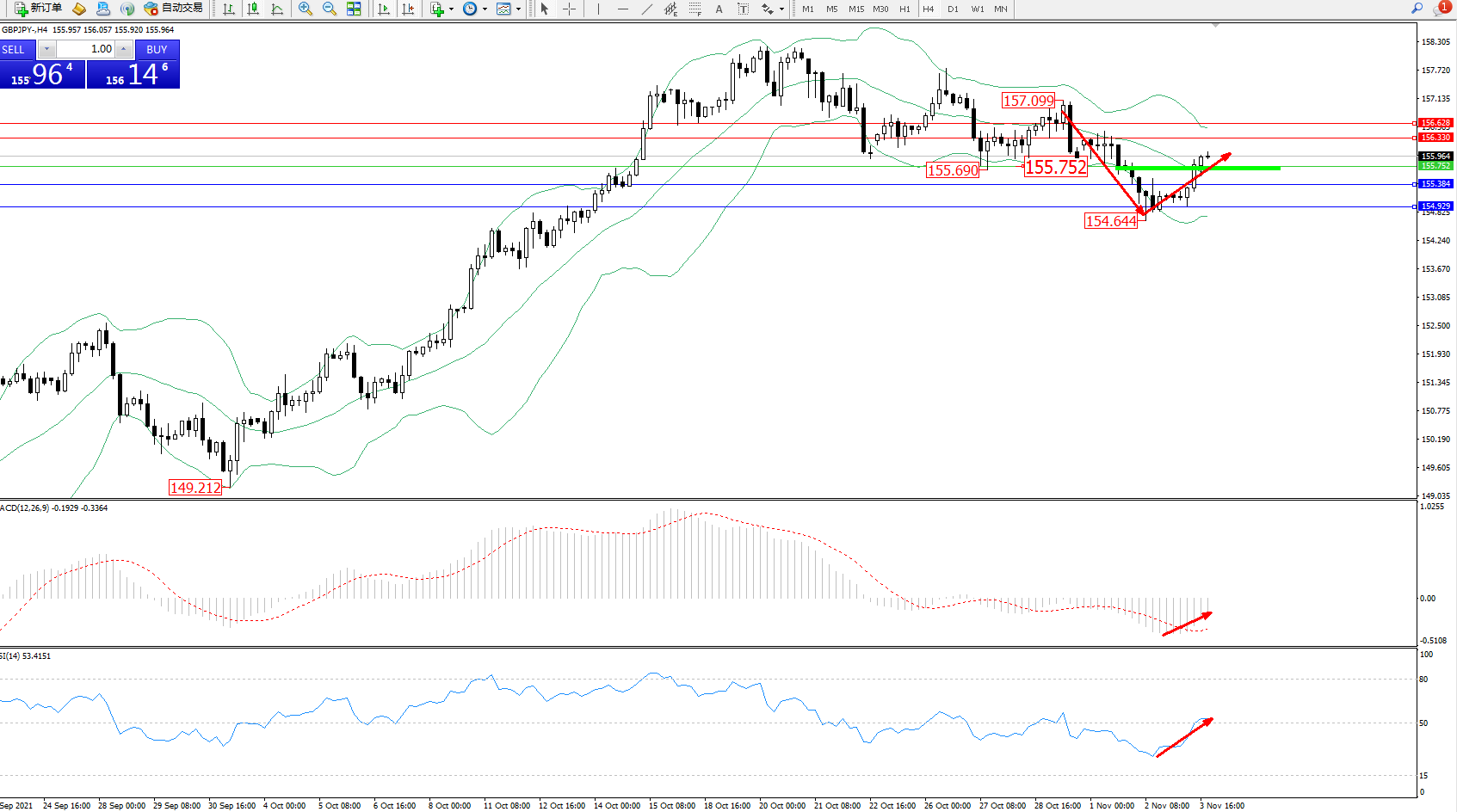 技术点评:空头动力延续布林带指标通道中下轨区间持续震荡下行,低位抵达154.644附近节点开始整理反转上移,处于布林带指标中上轨区间窄幅整理,多头反转上移走势或将持续,布林带指标呈向下移动走势后,低位开始收口平移,MACD指标处于空头区域低位整理缓慢上行,RSI指标处于空头区域低位维持震荡上移至50均衡线上側徘徊;