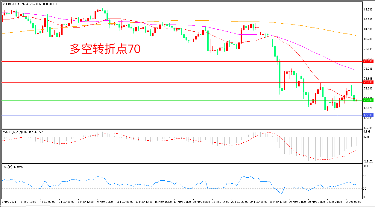 交易策略:在70.00之下看跌,目标67.50                65.00