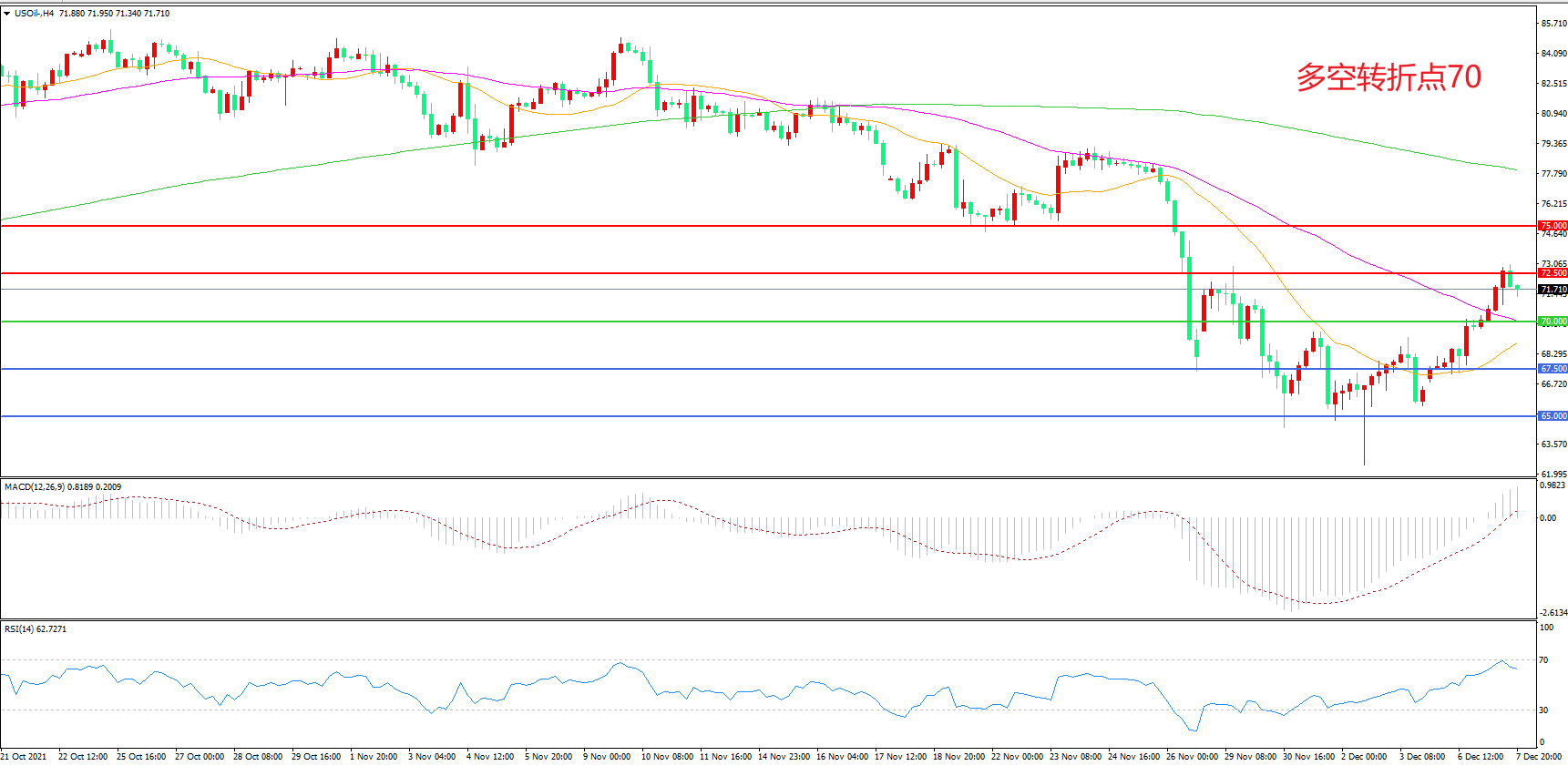 周二(12月7日),随着奥密克戎新变种的担忧缓解,风险情绪回温,美国WTI原油强势反弹,收报71.71美元/桶。美国此前还表示,伊朗重新加入核协议的机会可能正在消失,这是美国对核协议谈判最悲观的评估之一,打压了对伊朗石油迅速重返市场的预期,晚间重点关注EIA数据表现,如果库存数据再度利好,油价可能再度飙升。