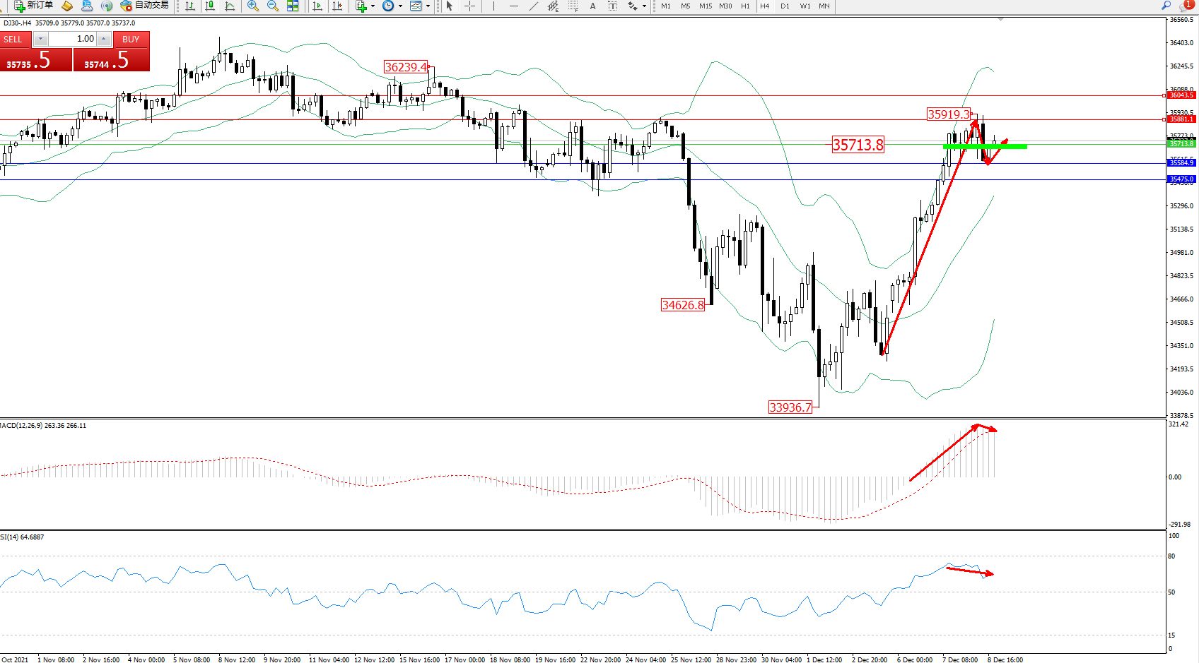 交易策略:35713上方看涨,目标35881、36043
