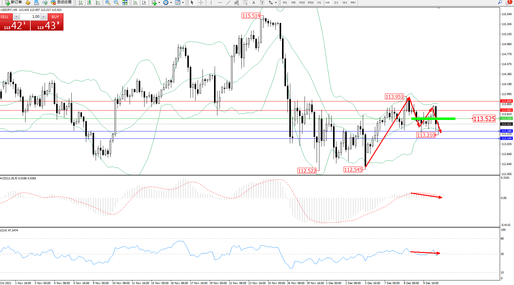 交易策略:113.525下方看跌,目标113.280、113.140