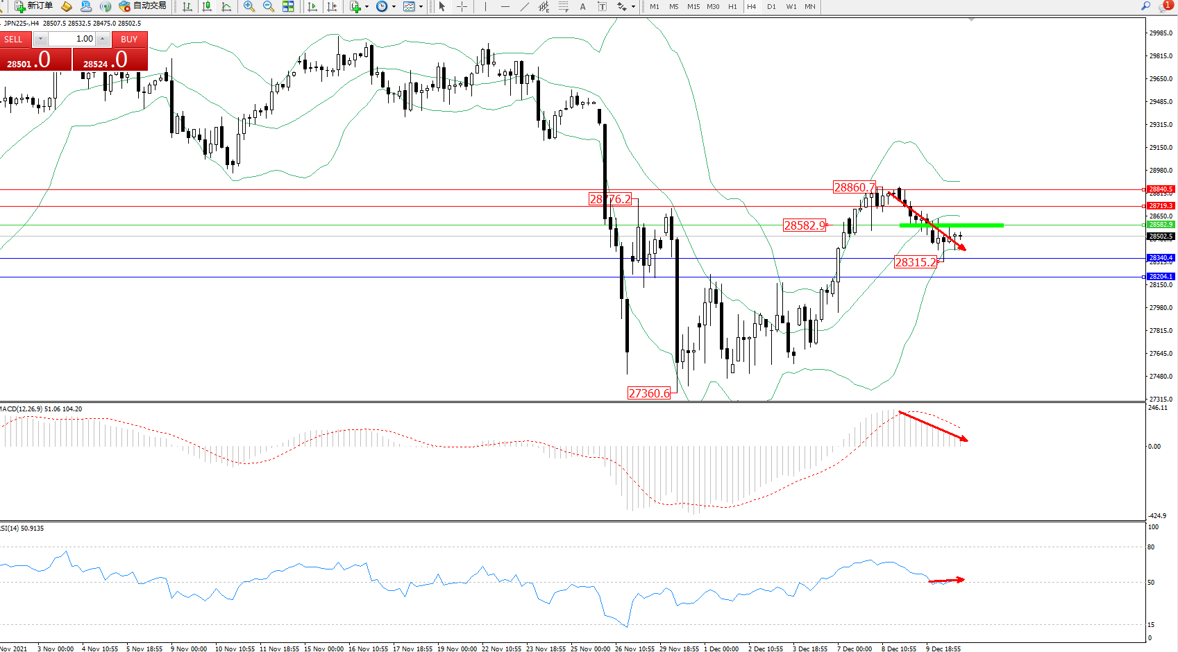 技术点评:多头动力延续布林带指标上轨附近持续震荡上扬,高位抵达28860位置后遇阻整理回撤,低位抵达28315位置开始整理,短期空头趋势下行后开始徘徊,布林带指标呈收口走势平移中,MACD指标多头区域高位整理缓慢下移后开始平移,RSI指标纠结于50均衡线附近弱势徘徊中;