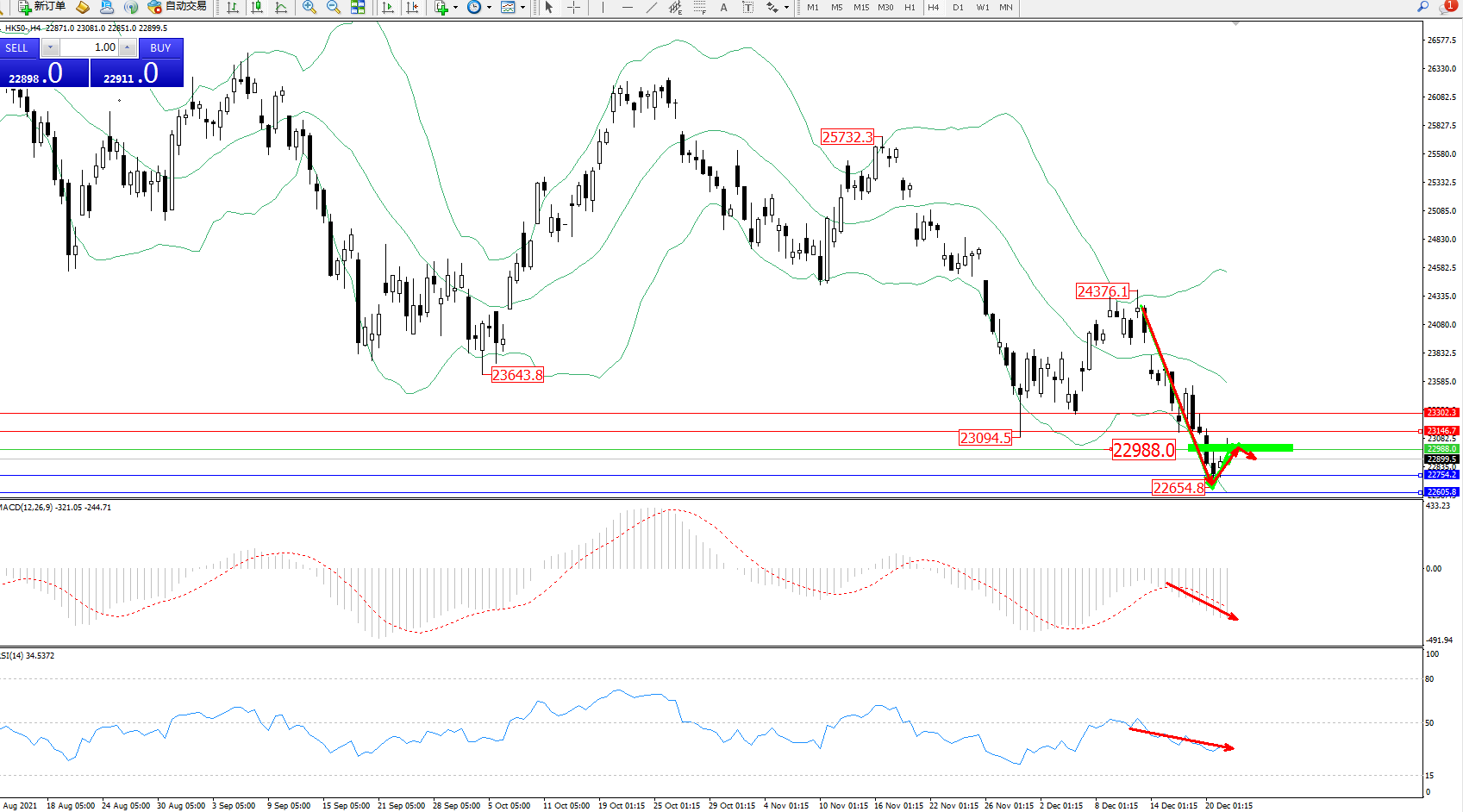 技术点评:空头动力延续布林带指标下轨附近持续震荡下行,低位抵达22654位置后得到短暂支撑震荡回升,但整体下行趋势依旧,布林带指标呈收口走势后开始有收口迹象,MACD指标处于空头区域维持整理缓慢下行后维持徘徊,RSI指标处于空头区域持续震荡平移;