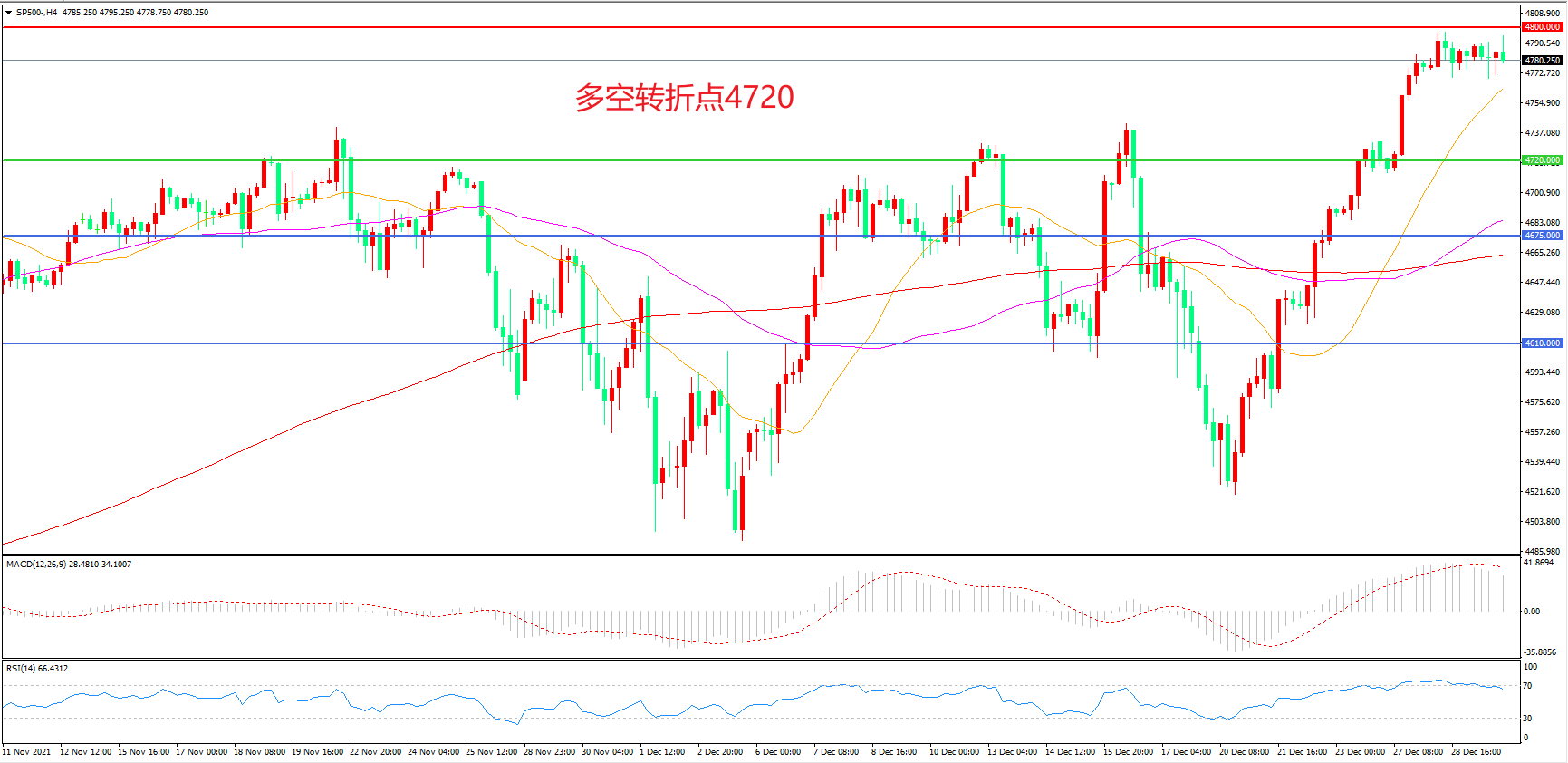 4小时图看,标普500延续高位震荡,短线走势偏强,均线系统呈多头排列,4800成为短期阻力,MACD红柱缩短,RSI走平,日内延续震荡概率较大。