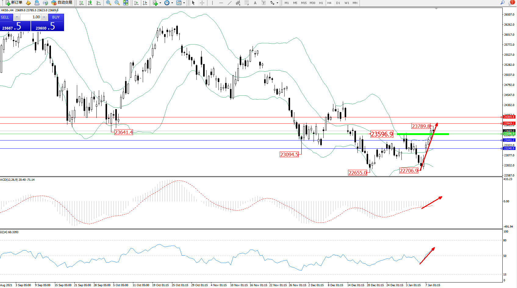 技术点评:低位多头动力强势拉升上扬,高位抵达23789位置后有继续攀升态势,布林带指标呈收口走势后开始逐渐张口,多头动力持续向上移动,MACD指标指标维持震荡上移至0轴线上方徘徊,RSI指标处于50均衡线上方多头区域震荡中;