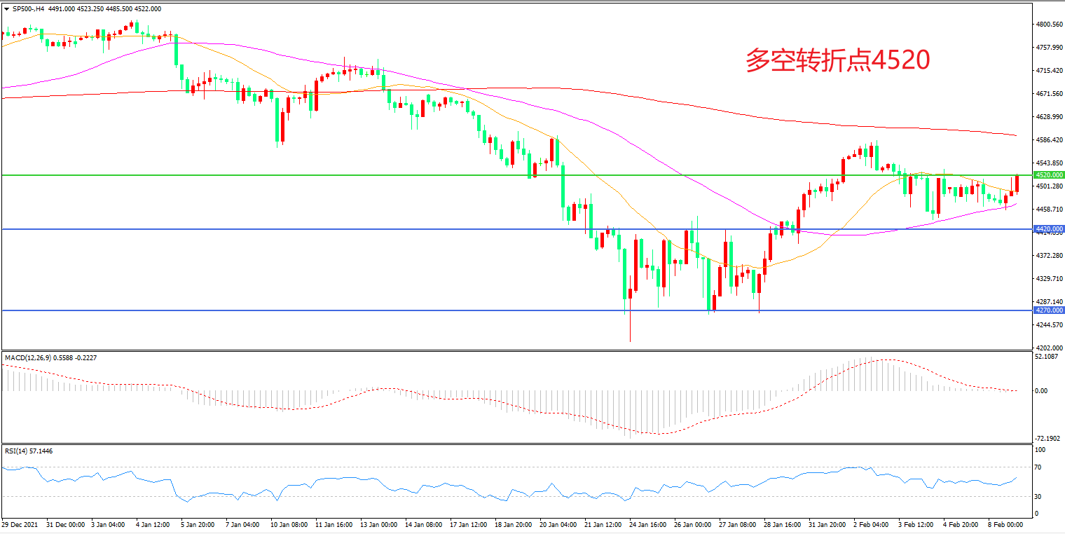 4小时图看,标普500以55周期均线为依托震荡上行,短线走势回暖,4520成为多空分水岭,MACD红柱缩短,RSI指标走平,日内延续震荡概率较大。